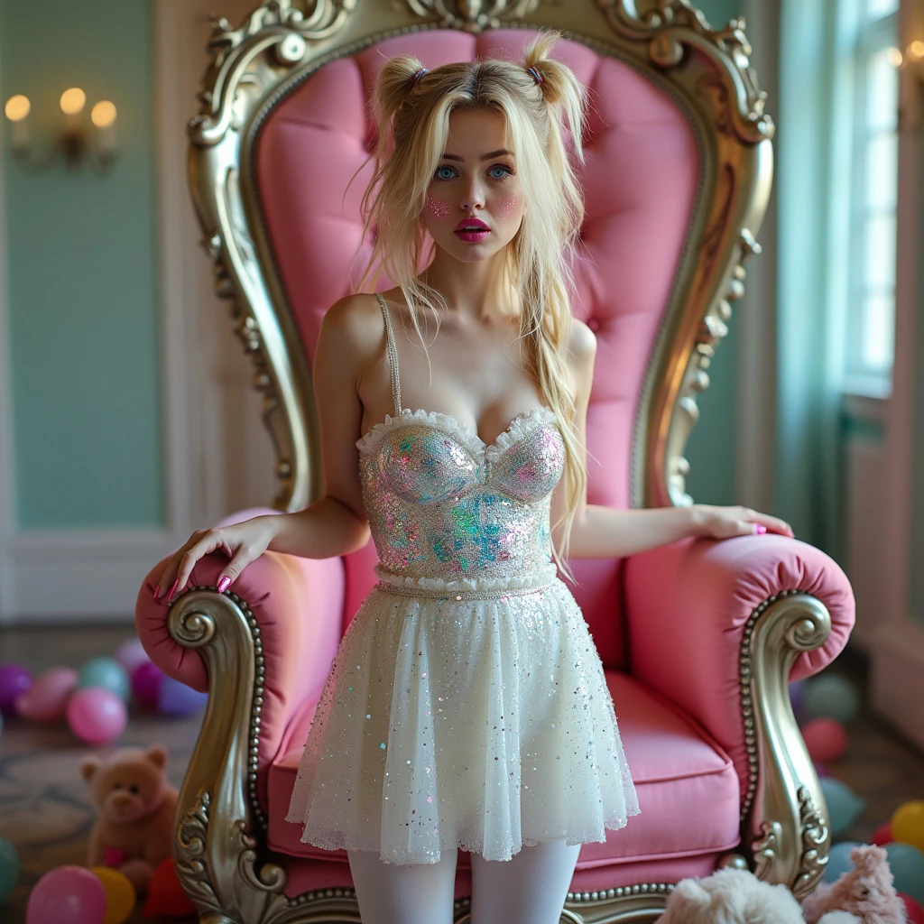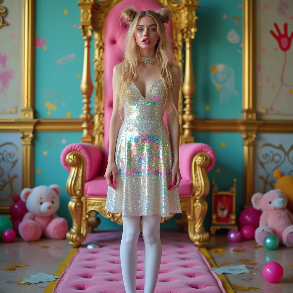 A photograph of a 21 year old woman standing in a throne room. The woman has long messy blond hair with streaks of pink, blue, and green in it. The woman also has a small bun on each side with a ponytail coming out. The woman has blue eyes and pink lipstick, she has glitter on her cheeks. The woman is wearing a baby-doll dress covered in white sequins with a colorful pattern through them, she is wearing white leggings under the dress and white glossy high heels. The woman is 175 cm tall and has perfect proportions. The woman has sparkly pink nail polish on. She has a confused expression. The throne room is very brightly lit, high key lighting, and has a chrome thrown with pink cushions. On the floor of the thrown room are stuffed animals, balloons, board games, full ash trays, empty wine glasses, empty wine bottles. The walls of the throne room have doodles in many colors. Anatomically correct hands.