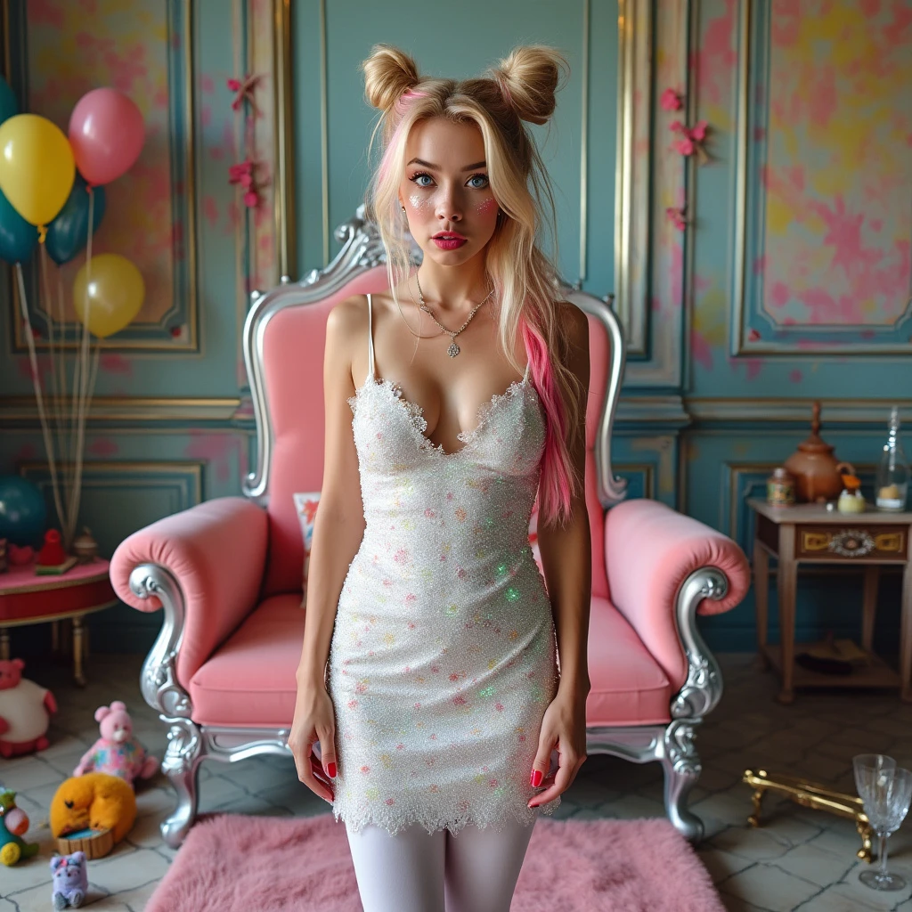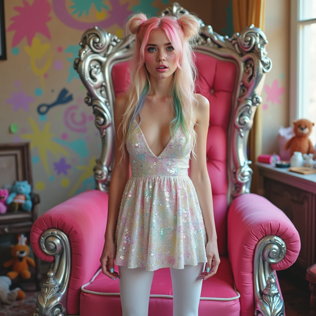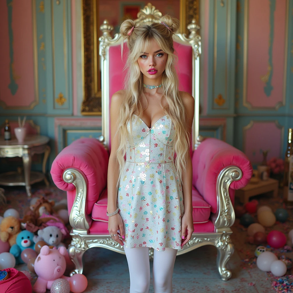 A photograph of a 21 year old woman standing in a throne room. The woman has long messy blond hair with streaks of pink, blue, and green in it. The woman also has a small bun on each side with a ponytail coming out. The woman has blue eyes and pink lipstick, she has glitter on her cheeks. The woman is wearing a baby-doll dress covered in white sequins with a colorful pattern through them, she is wearing white leggings under the dress and white glossy high heels. The woman is 175 cm tall and has perfect proportions. The woman has sparkly pink nail polish on. She has a confused expression. The throne room is very brightly lit, high key lighting, and has a chrome thrown with pink cushions. On the floor of the thrown room are stuffed animals, balloons, board games, full ash trays, empty wine glasses, empty wine bottles. The walls of the throne room have doodles in many colors. Anatomically correct hands.