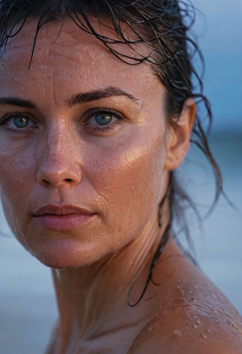 "Detailed close-up of a 40-year-old woman's face and shoulders as she stands on the beach at twilight, her skin glowing in the soft, fading light, every wrinkle and imperfection captured with hyper-realistic clarity, shot with a 100mm macro lens at f/2.8, the background a blur of darkening ocean and sky, her wet hair clinging to her face, her expression pensive, eyes gazing out into the distance."