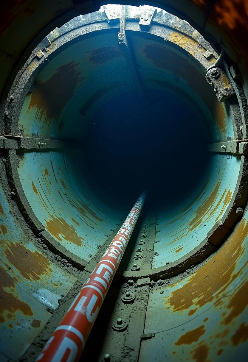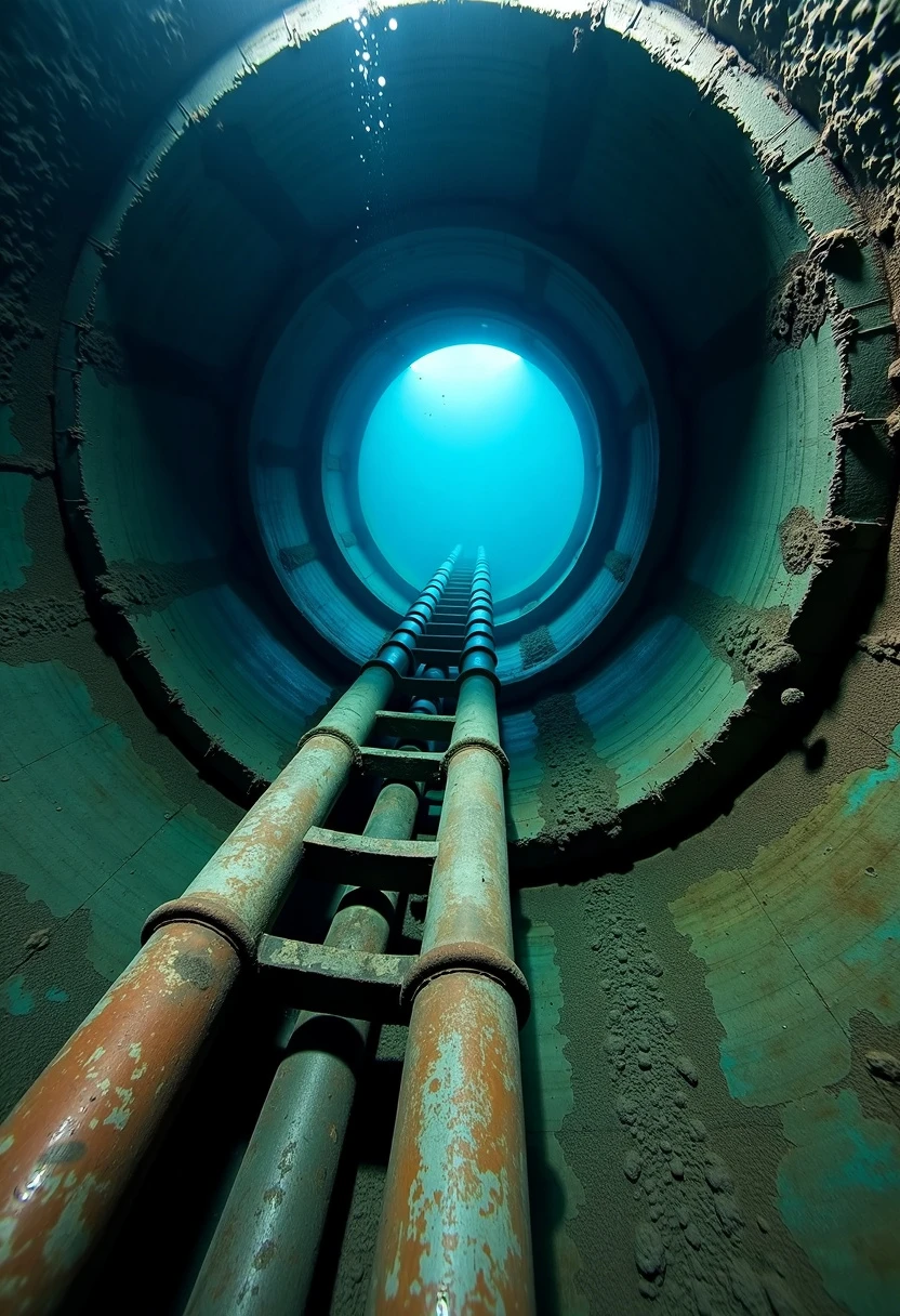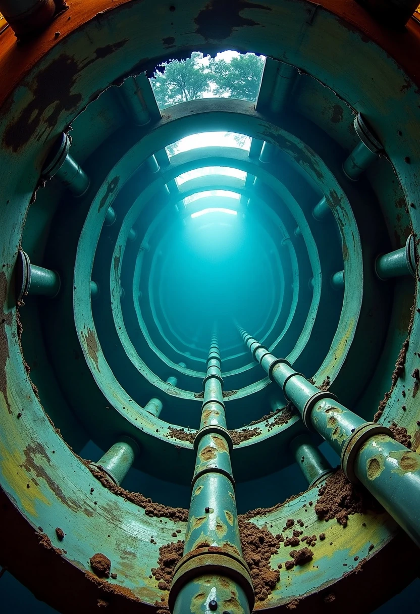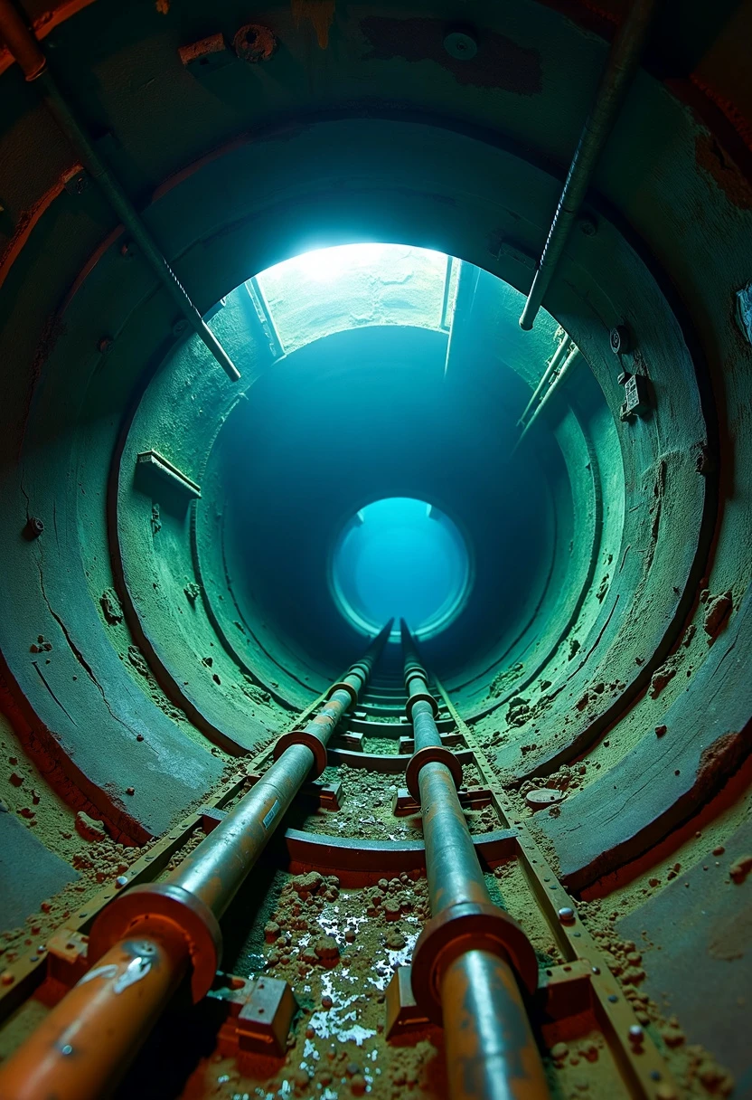 Wide angle photography of an huge dark underwater metal vertical round shaft whit metal pipes running inside it, underwater photography, dark, mystery, scary, rust, decay