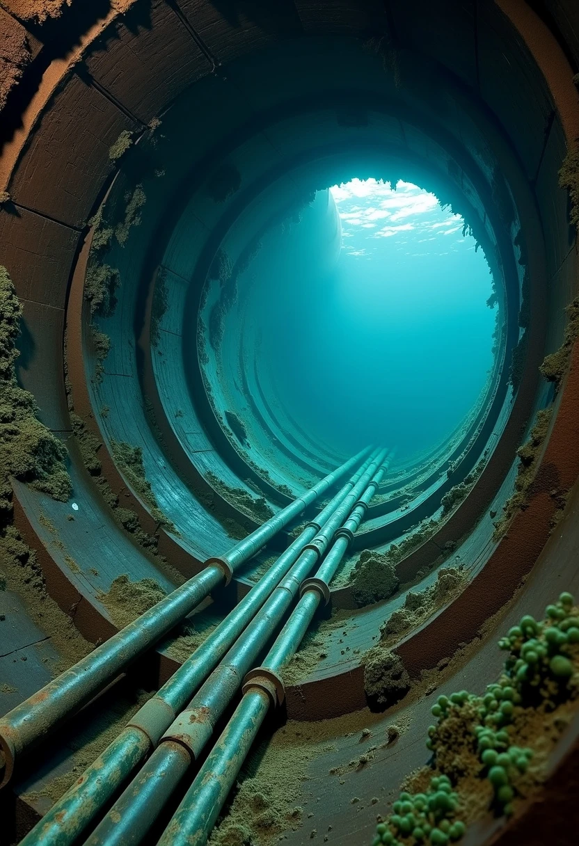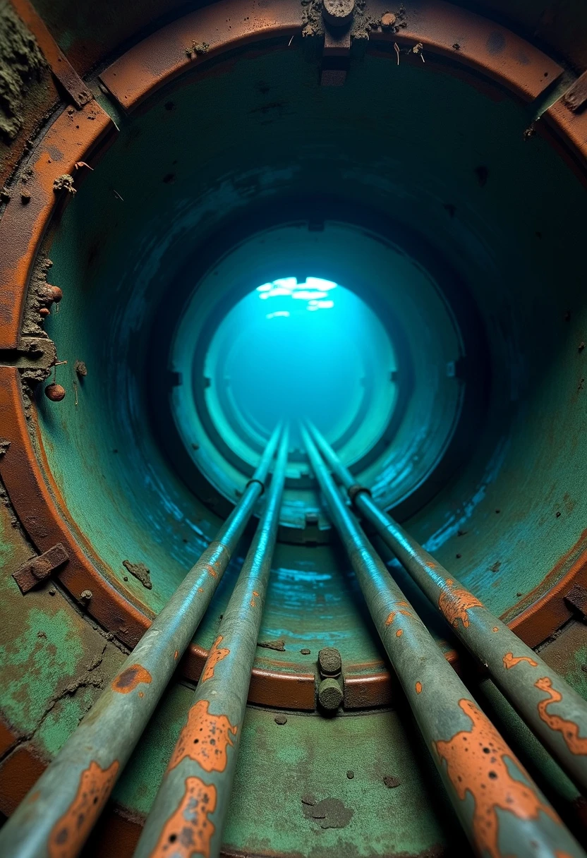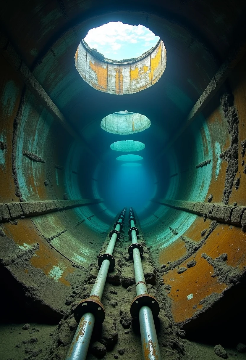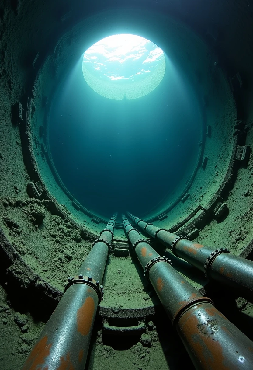photography of an huge round underwater metal vertical shaft whit metal pipes running inside it, underwater photography, dark, mystery, scary, rust, decay