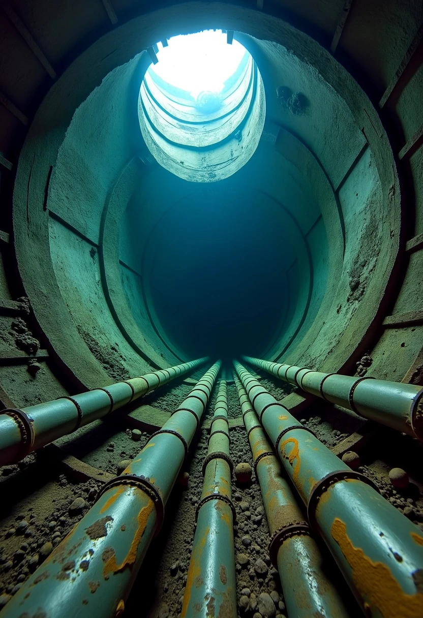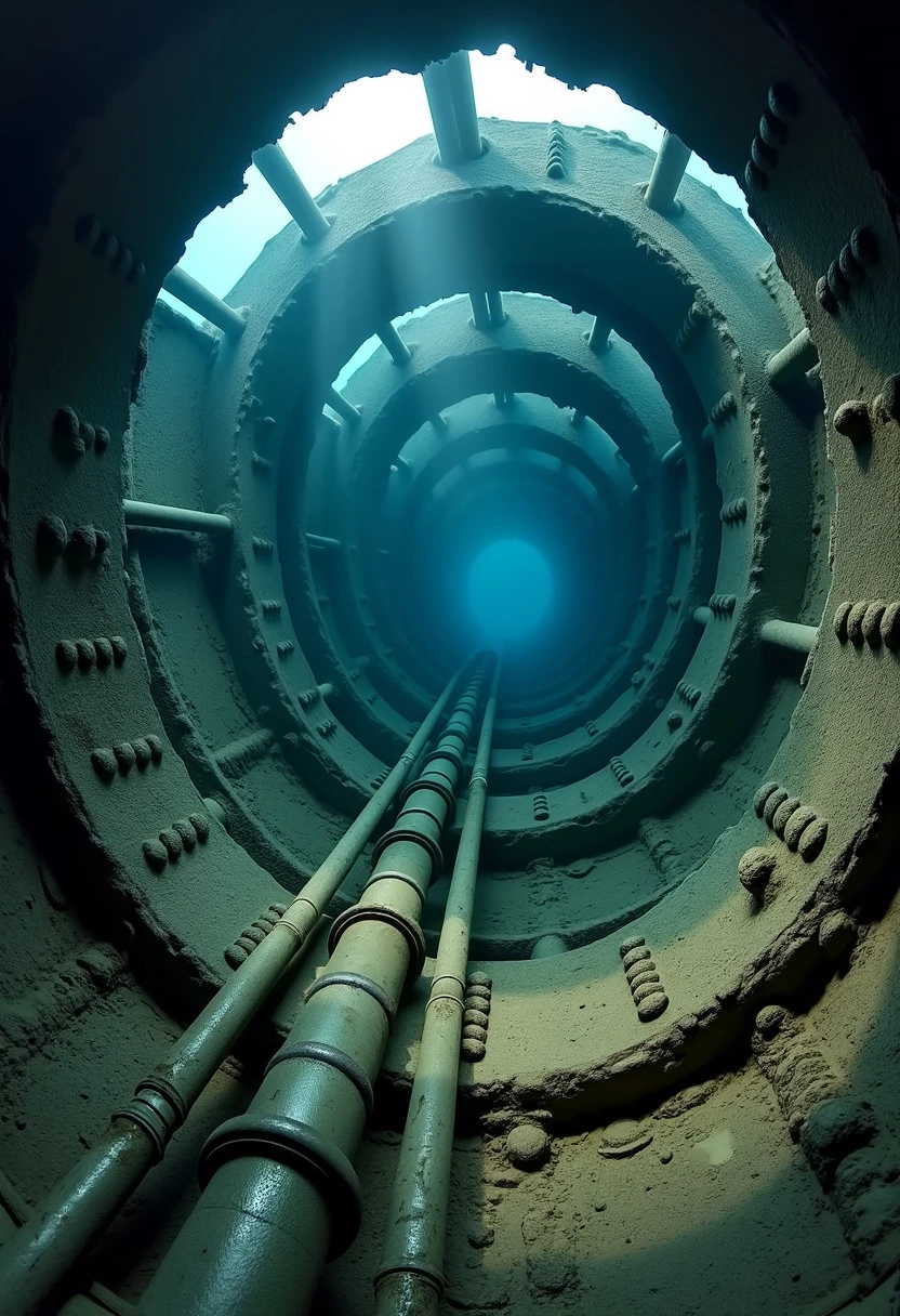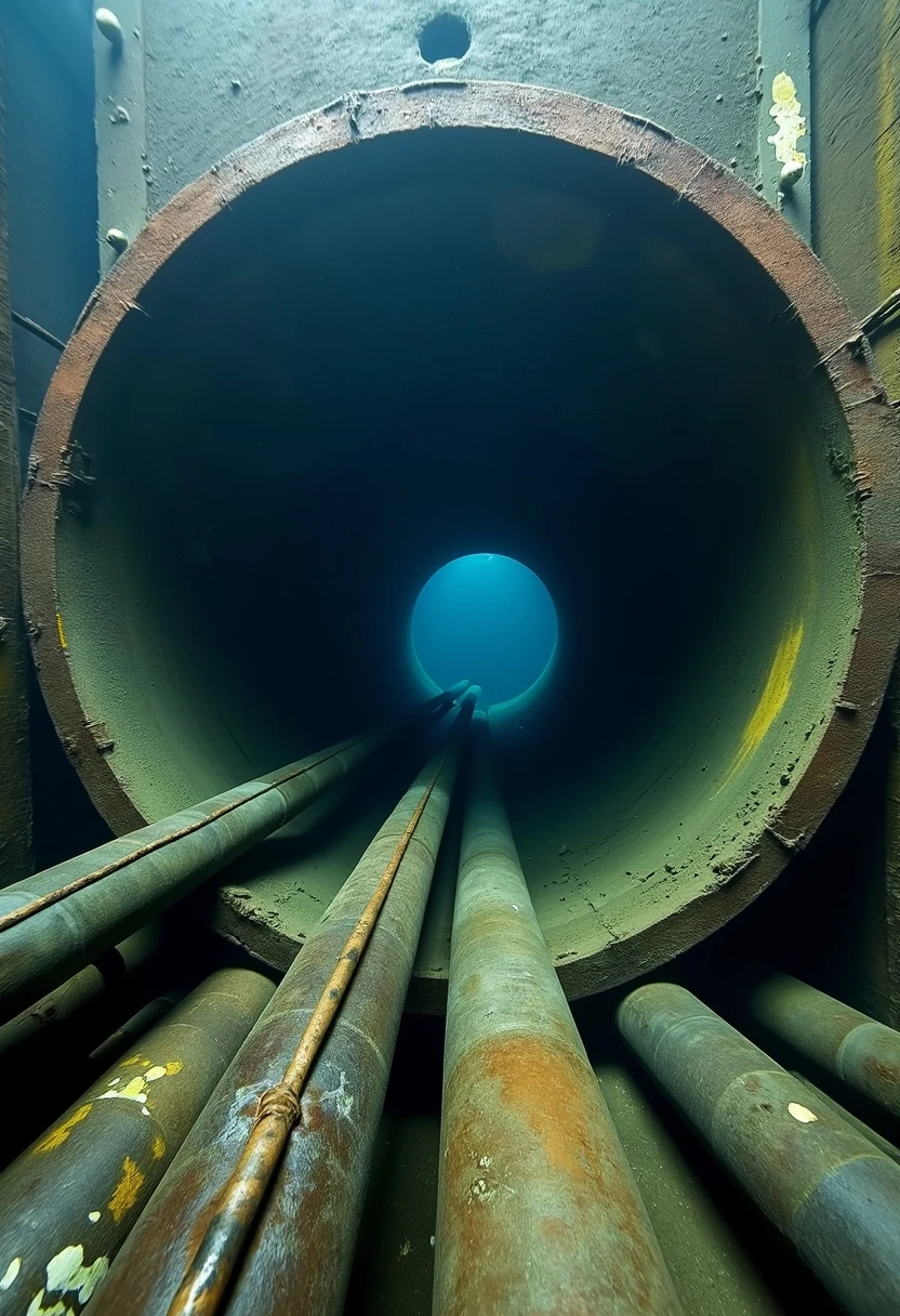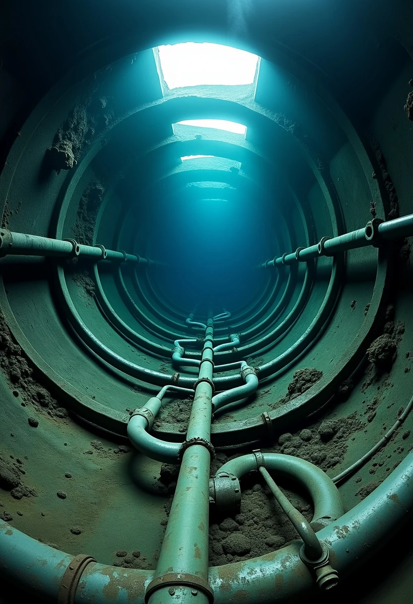 photography of an huge round underwater metal vertical shaft whit lots of metal pipes running inside it, underwater photography, dark, mystery, scary, rust, decay