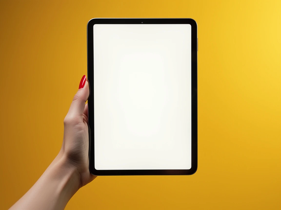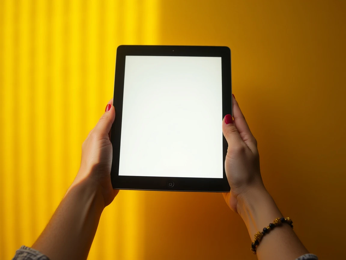 a faceless photo. a sophisticated modern young woman holding an ipad pro beautiful detailed hand , the image is for her body, a faceless photo. the ipad pro is in the center of the image. the black ipad displays the white screen in the website design, the background is colors yello nuance, Apple Macintosh advertising style
