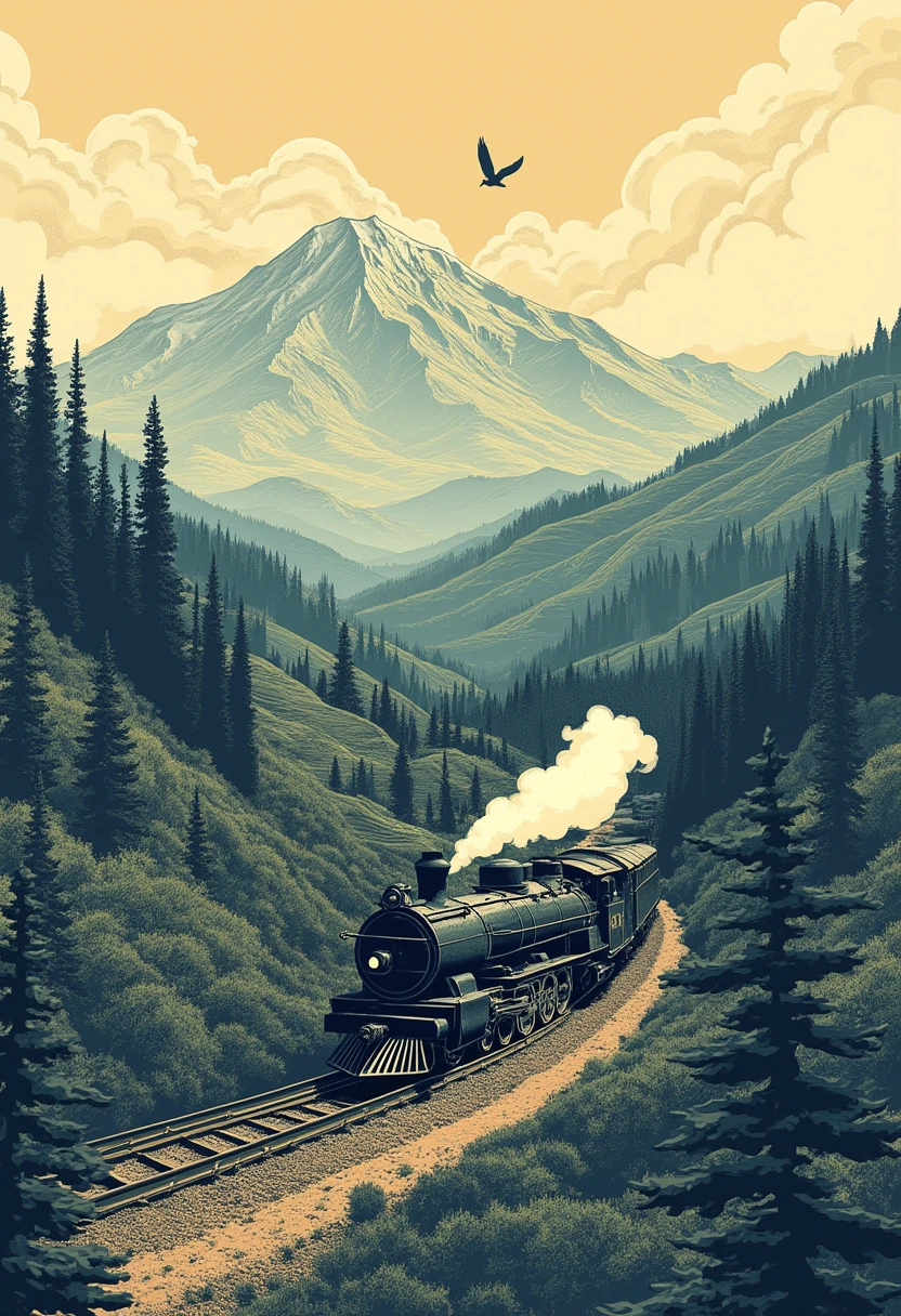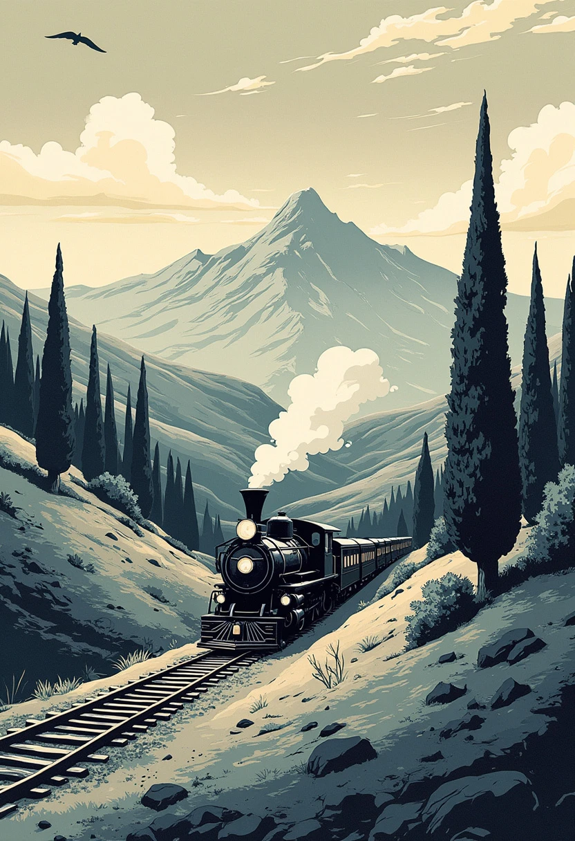 An anime illustration of a cross-hatching style, resembling a woodcut or etching. It depicts a scenic landscape dominated by rolling hills and a majestic mountain range in the background. The foreground showcases a vintage steam locomotive, depicted with intricate detailing, chugging through the hills, emitting a trail of smoke. The locomotive is positioned centrally, creating a dynamic focal point. Surrounding the train, the hills are depicted with layered, textured patterns, suggesting undulating terrain. Tall, slender cypress trees are scattered throughout the landscape, adding to the naturalistic feel. In the sky above, a bird is soaring, creating a sense of scale and depth as it contrasts with the flat, detailed ground elements. The sky is filled with soft, wispy clouds, enhancing the serene atmosphere. The overall style is reminiscent of vintage travel posters or early 20th-century illustrations, with a strong emphasis on line work and shading to create a three-dimensional effect. The image is balanced with the train as the central element, surrounded by a serene, picturesque landscape, evoking a sense of adventure and exploration. Hayao Miyazaki, Hiroshi Nagai, Hergé and Studio Ghibli. High resolution, ultra detailed, high intricate, high cartoonish, high quality, high sharpness, high contrast, beautiful, high octane render, high definition.