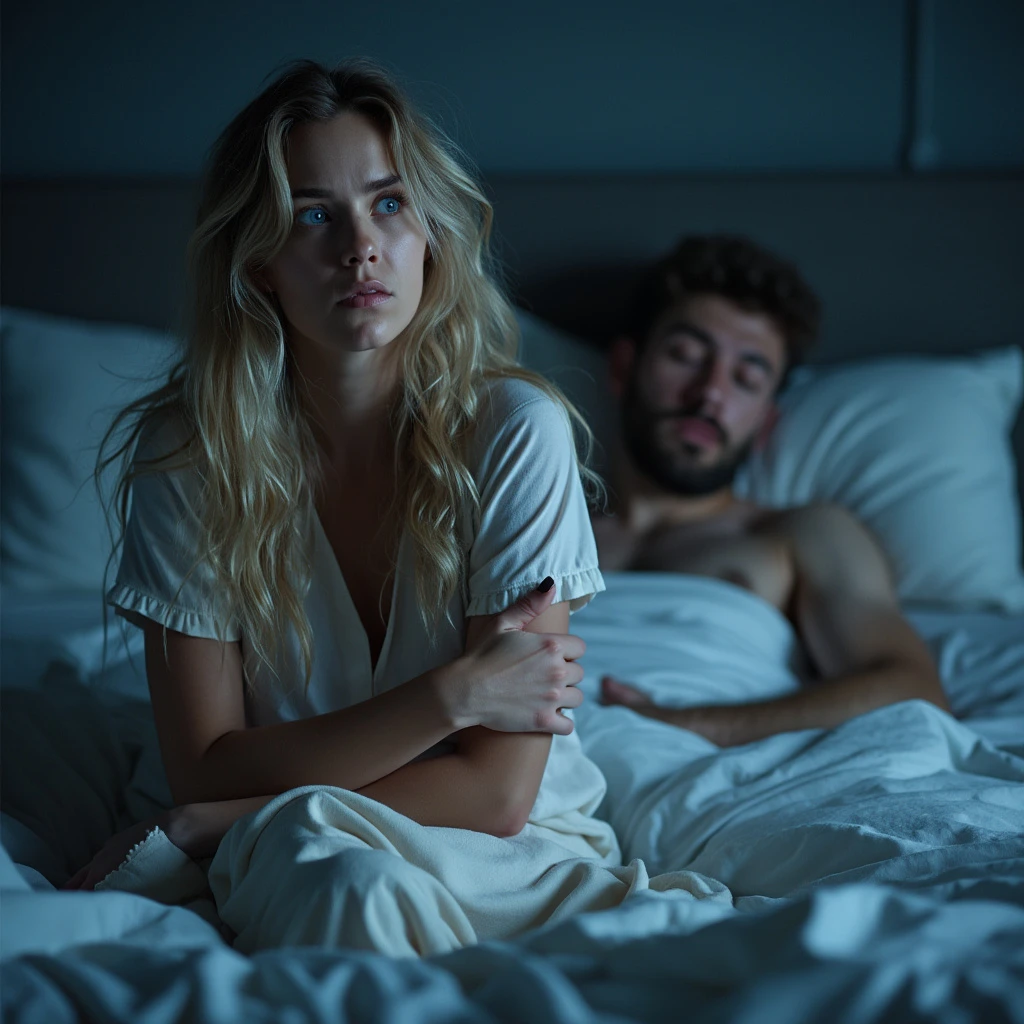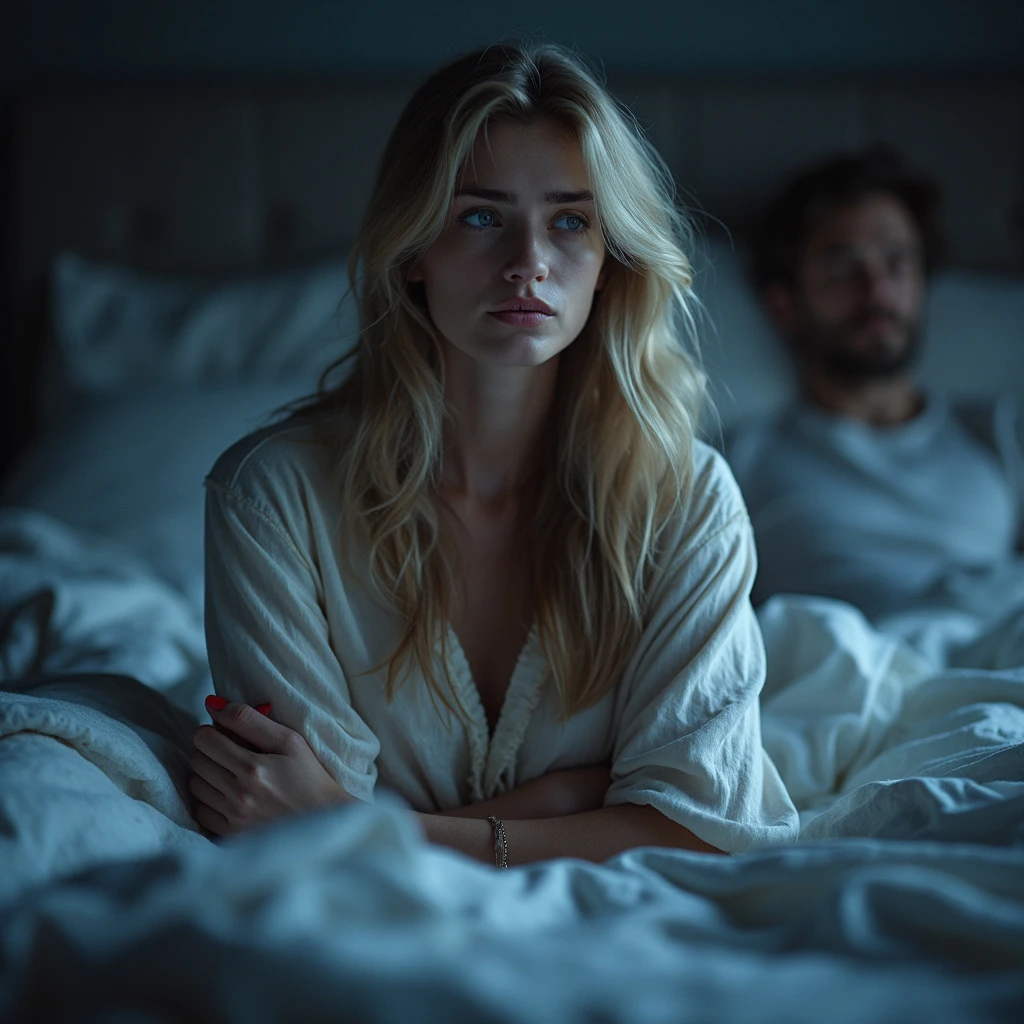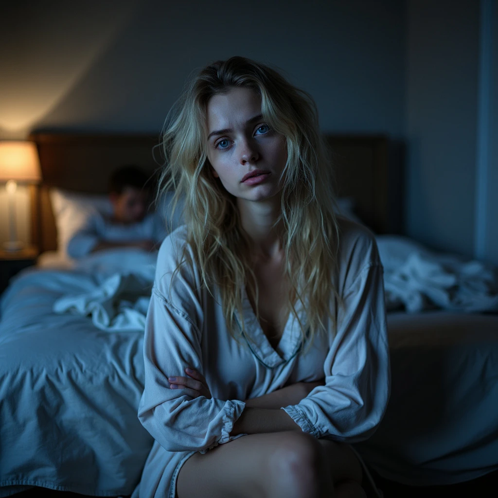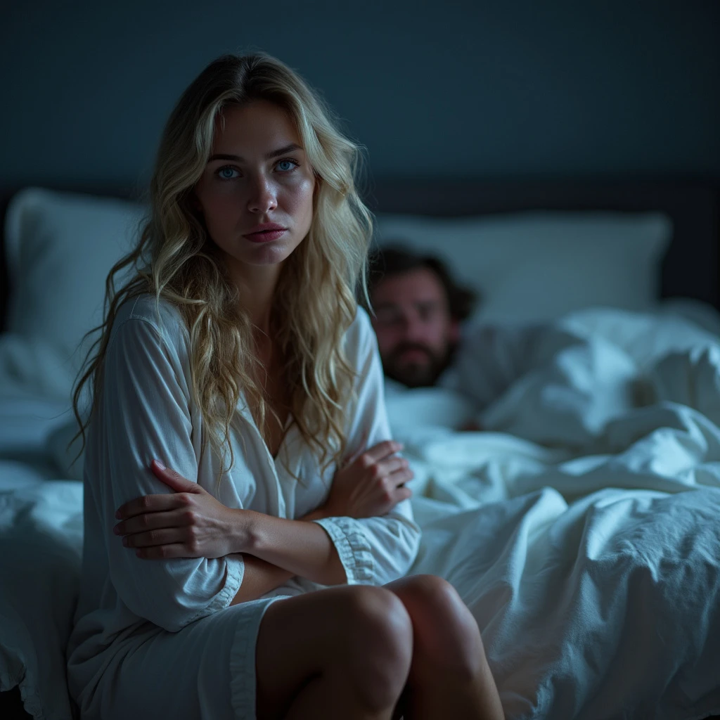 a 21 year old woman sitting at the foot of her bed at night. The room is dark blurry, her husband is asleep in the bed under the blanket. The woman has long wavy blond hair and blue eyes. She is wearing a night gown and sitting with her arms crossed at the foot of the bed. She looks miffed. It is night time and dark.