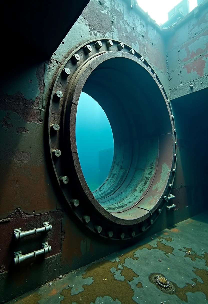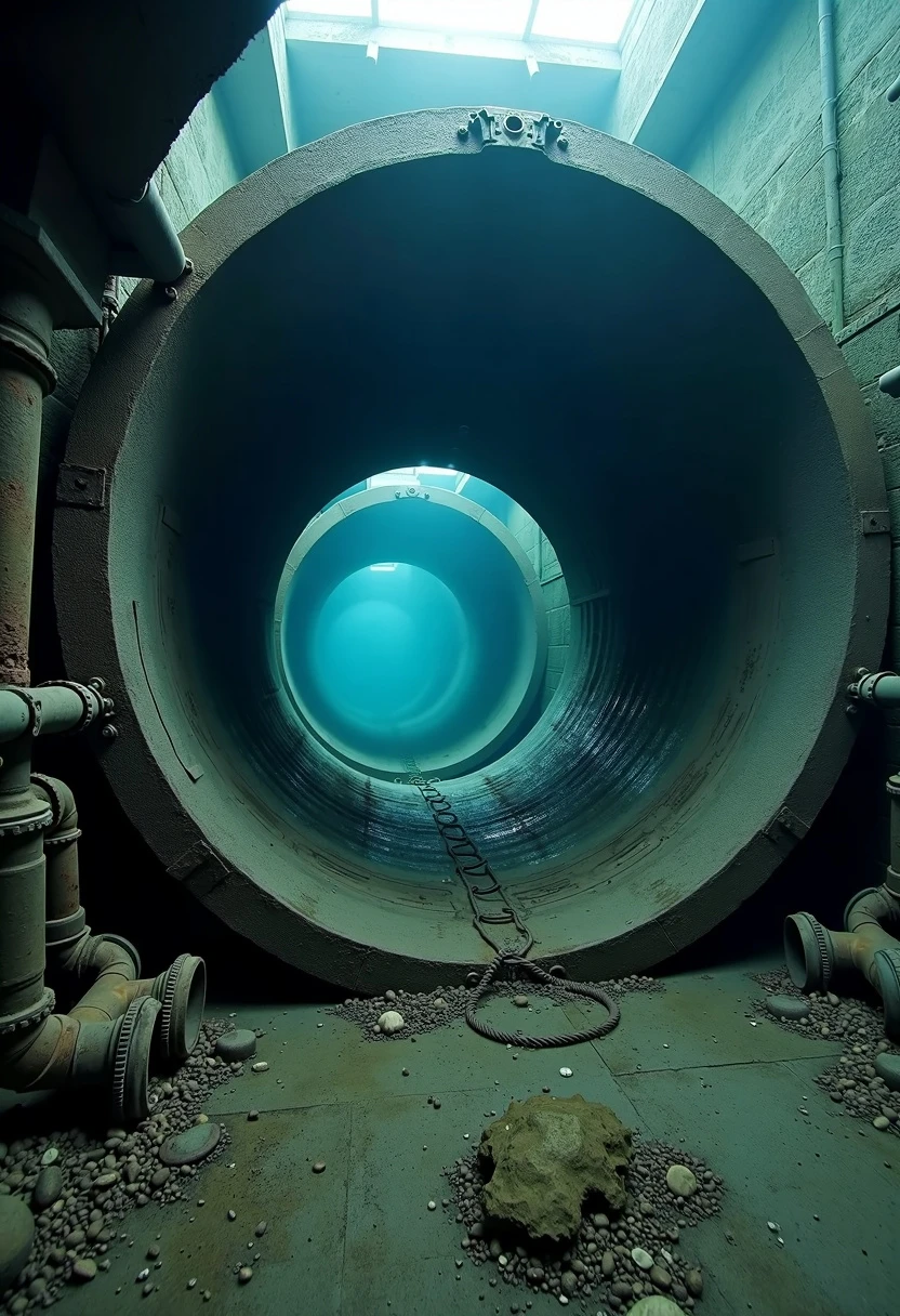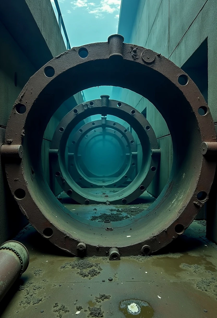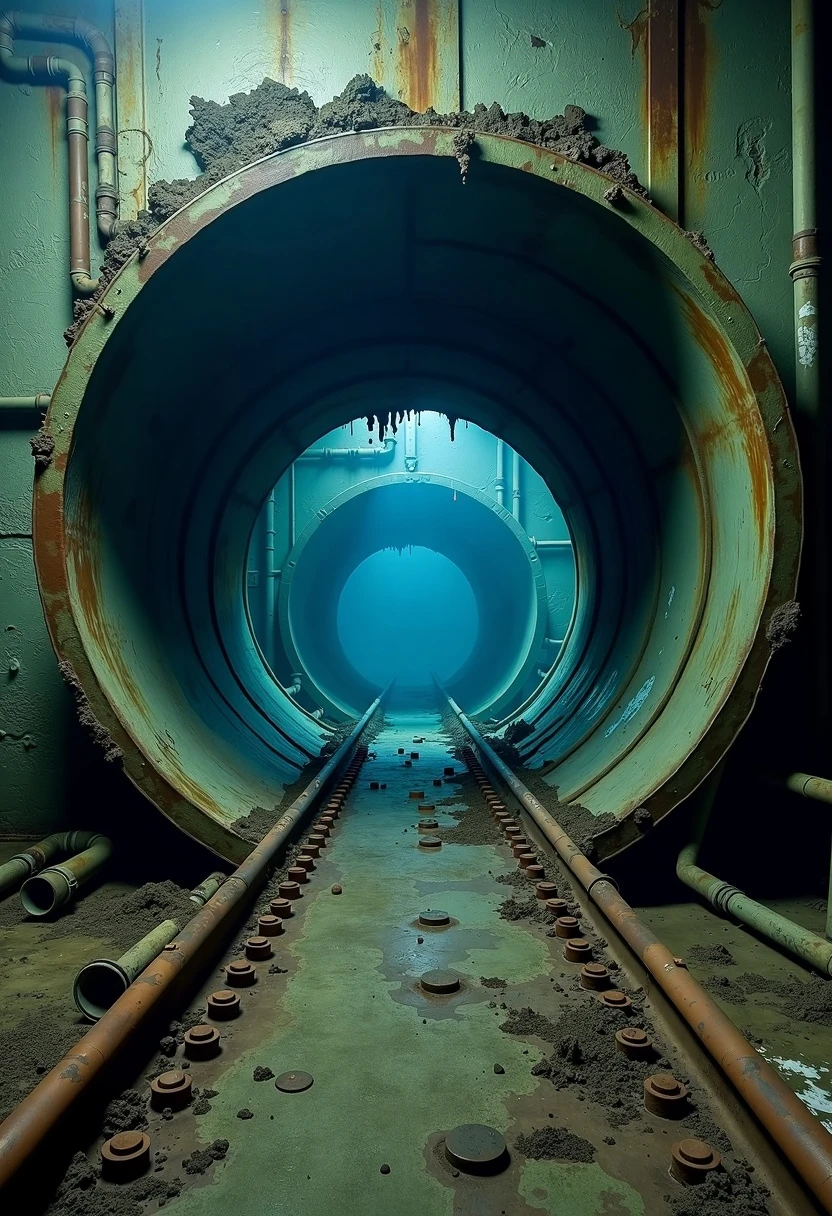underwater huge dark metal round pipe that has lots of pipes going along its wall, rust, decay, scary, cinematic