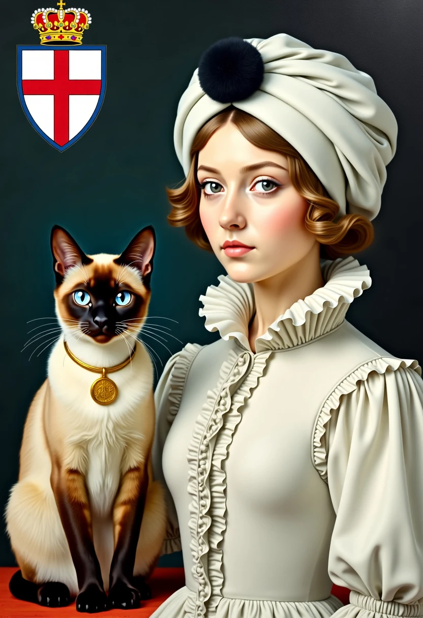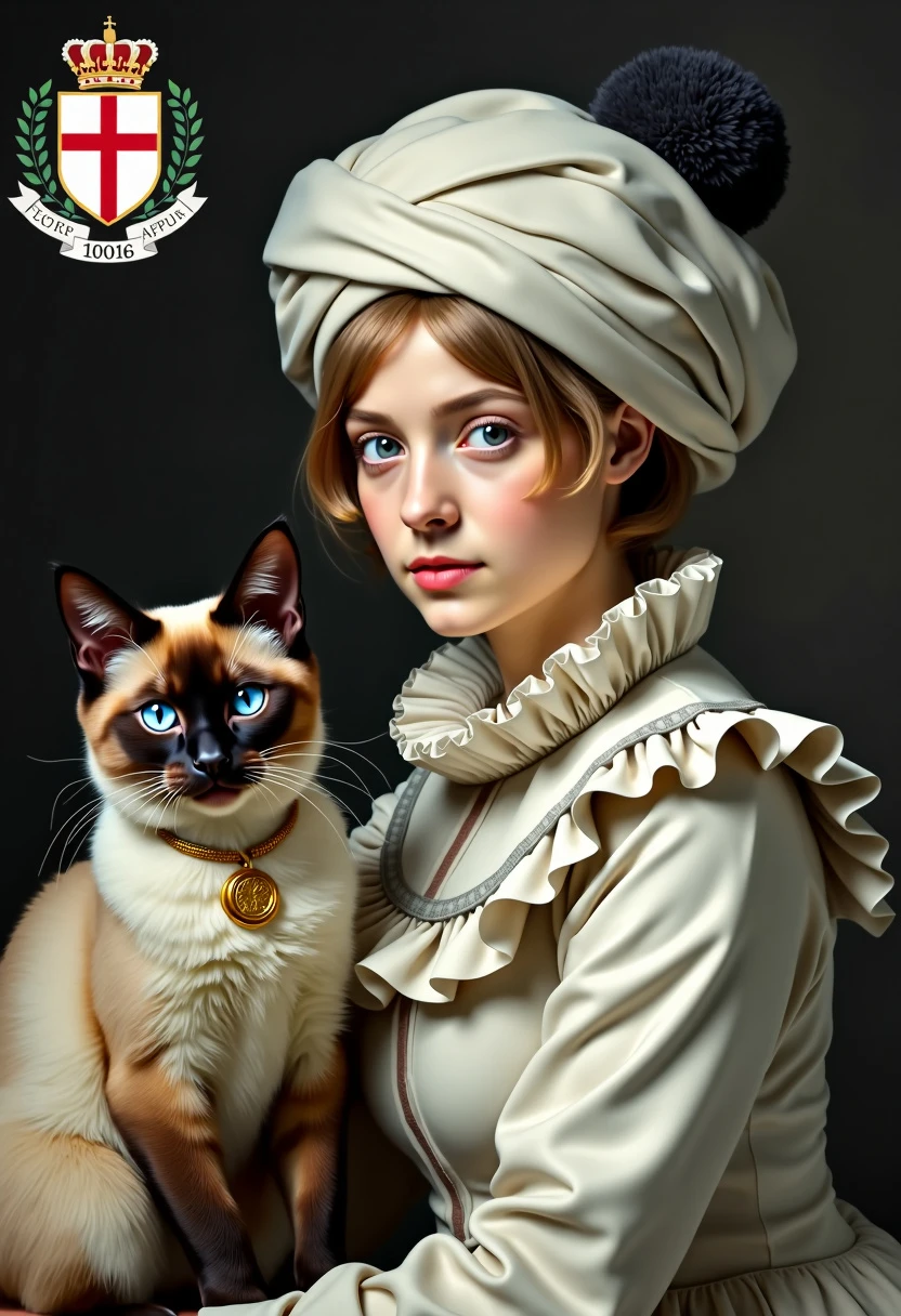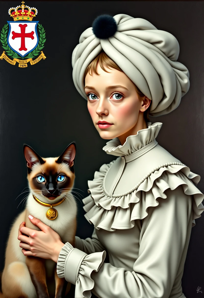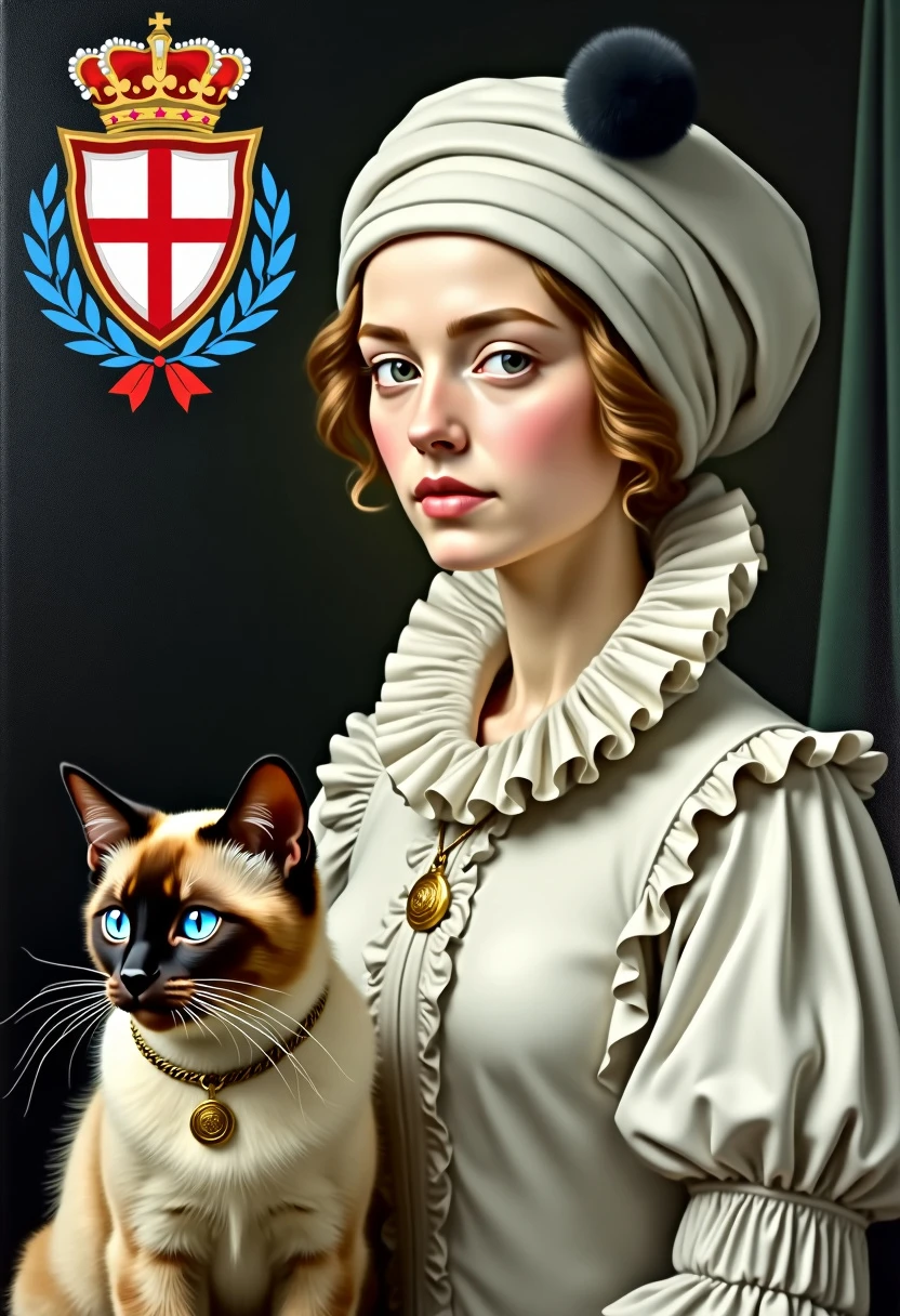 Image is a stylized painting featuring a person and a cat against a dark background. The person, with fair skin and delicate facial features, is dressed in a white, ruffled outfit with a large collar and a turban-like headpiece adorned with a black pom-pom. The individual has short, light brown hair peeking from under the headpiece. To the left, a Siamese cat with striking blue eyes and a cream-colored coat with dark brown points sits, wearing a gold medallion around its neck. In the top left corner, there is a crest with a crown and a red cross on a white shield, surrounded by a blue and gold border.