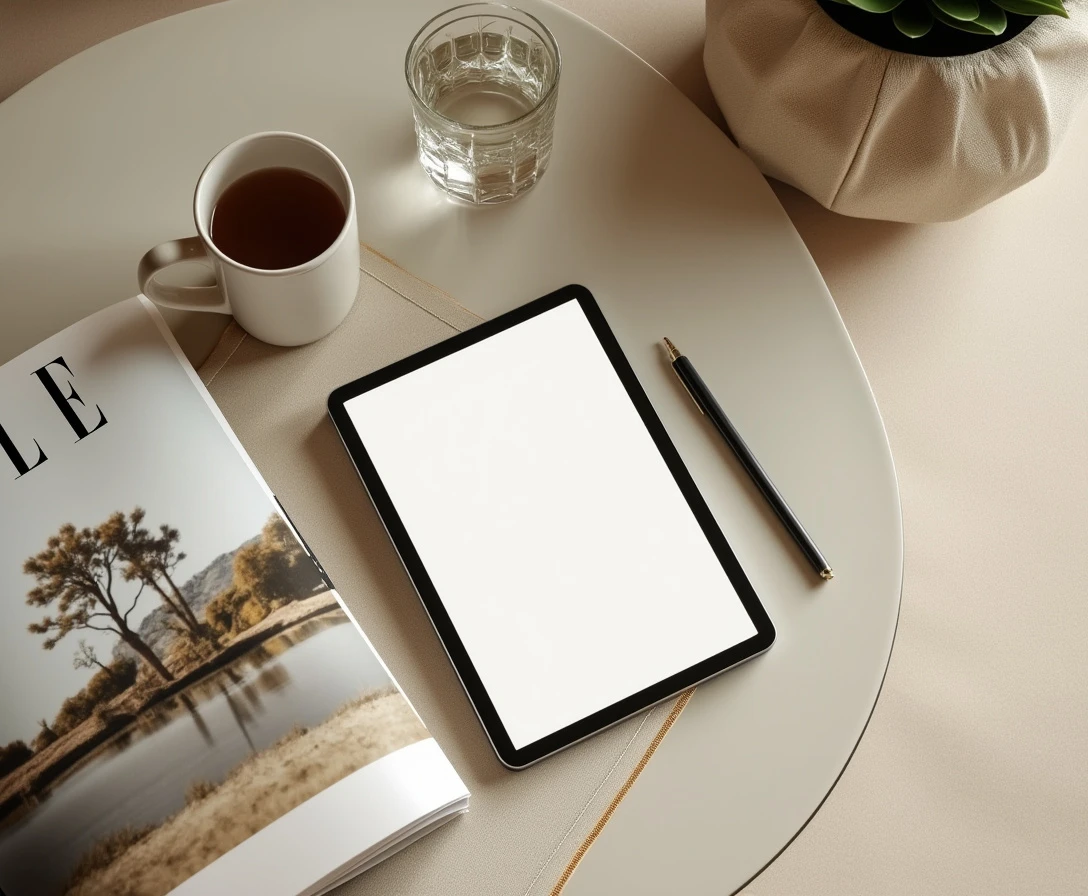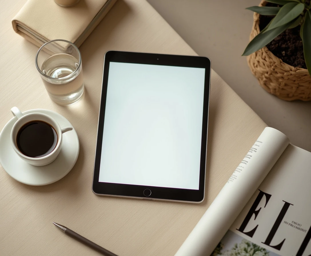 interesting angle decoration magazine style close up top view of sophisticated office apartment furniture detailed close up of close-up black iPad Pro screens display white screen facing camera placed or magazine ELLE, the image is for decorative objects, coffee cup,glass of water, a photo without a face. the background is a shade of sand colors the minimalist background of the apartment is in a pastel cream shade and ivory colors, soft and subdued light, advertising style