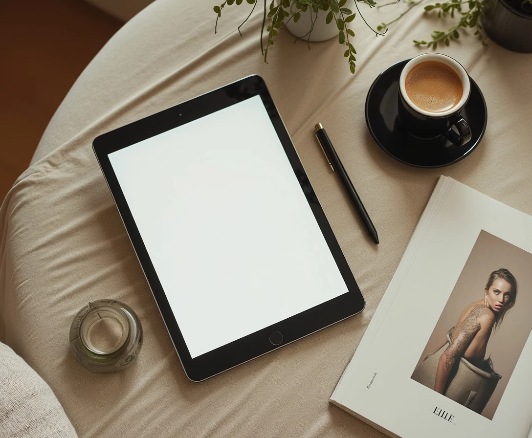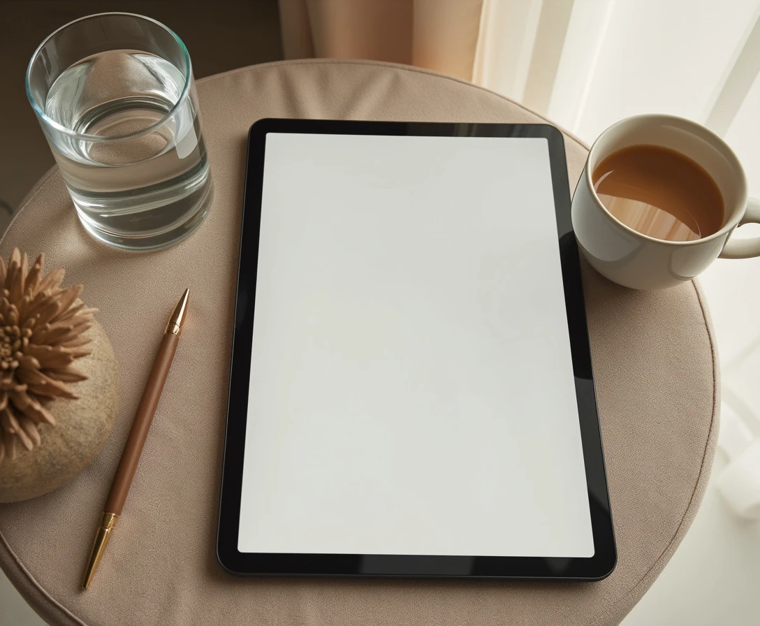 photo interesting angle decoration magazine style close up top view of sophisticated office apartment furniture detailed close up of close-up black iPad Pro screens display white screen facing camera placed or fashion and decoration magazine ELLE, the image is for decorative objects, coffee cup,glass of water, a photo without a face. the background is a shade of sand colors the minimalist background of the apartment is in a pastel cream shade and ivory colors, soft and subdued light, advertising style
