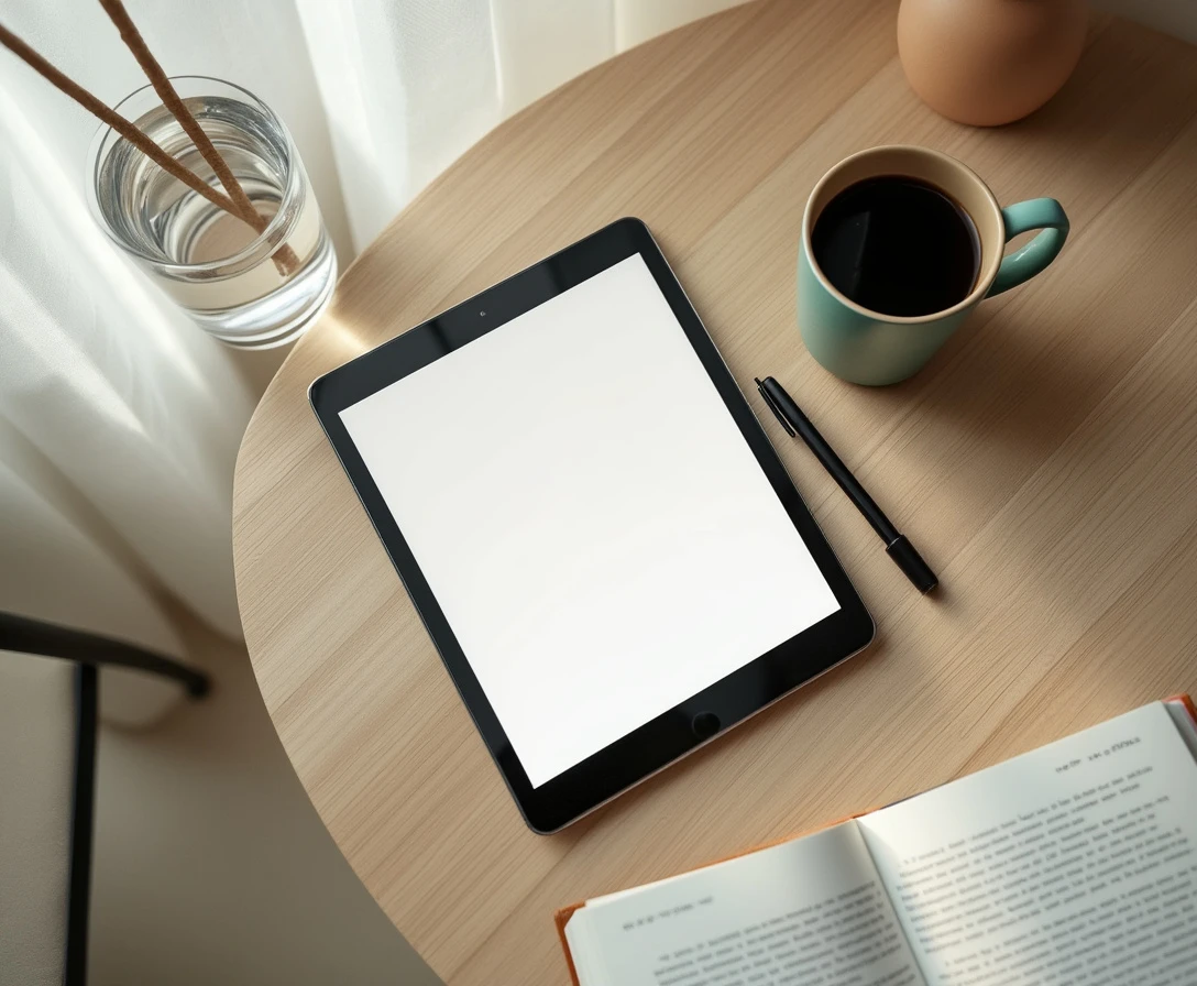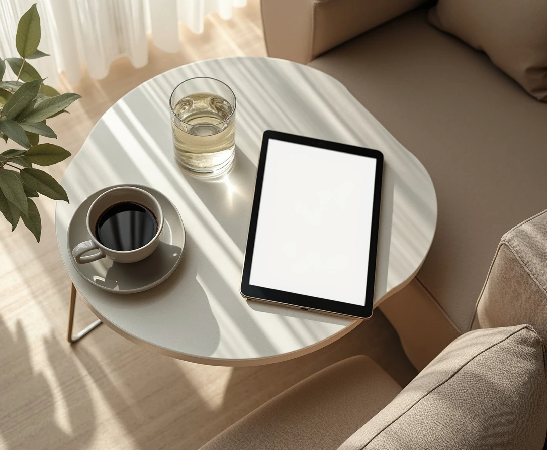 photo interesting angle decoration magazine style close up top view of sophisticated office apartment furniture detailed close up of black iPad Pro screens display white screen facing camera placed or fashion and decoration magazine ELLE, the image is for decorative objects, coffee cup,glass of water, a photo without a face. the background is a shade of sand colors the minimalist background of the apartment is in a pastel cream shade and ivory colors, soft and subdued light, advertising style