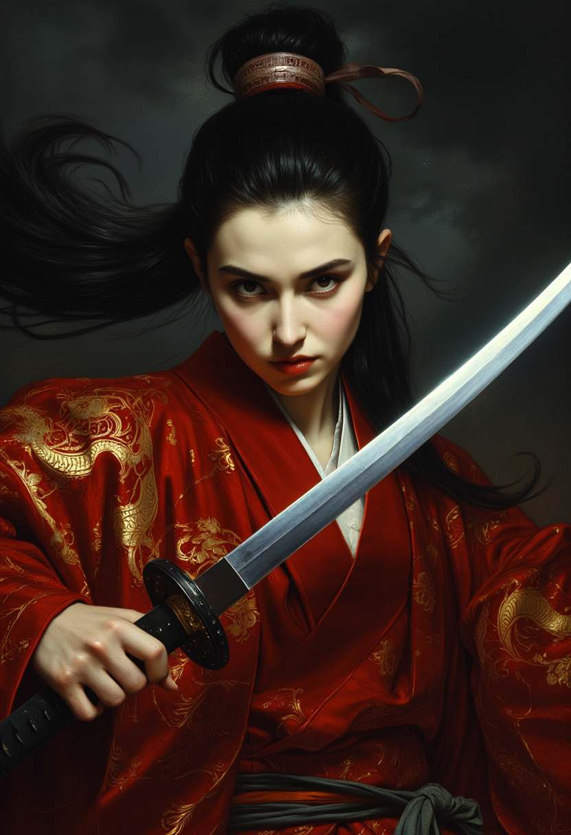 oil painting, art of jean leon gerome, A beautiful young samurai woman, her dark hair tied back into a high ponytail, leaving her face exposed. She wears a deep red kimono, intricately embroidered with golden dragons, and her katana rests unsheathed in front of her, its blade glinting under the moonlight. Her dark, almond-shaped eyes are intense, filled with quiet fury as she gazes forward, prepared for battle. bokeh, masterpiece, high quality, film grain, hyper detailed <lora:flux_realism_lora:0.7> <lora:fluxenhancer:0.2> <lora:Aura_Flux:0.3> <lora:Dever_Flux_Enhancer:.5> <lora:Orientalism-000005:0.7>