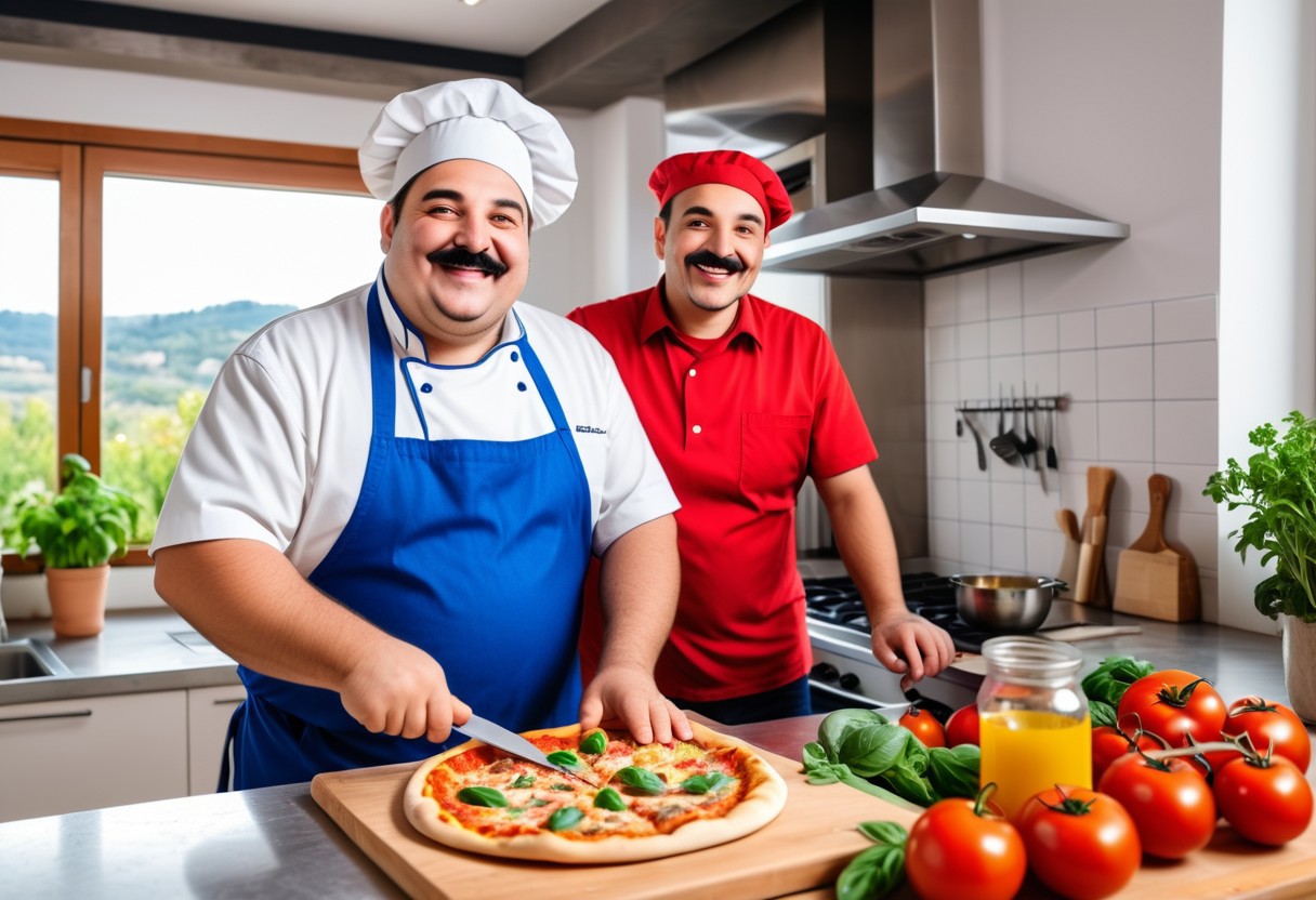 an italian chubby man with only thick mustache with a chef hat, very happy cooking a pizza in the kitchen, red shirt, blue apron, window with a beautiful scene on the background