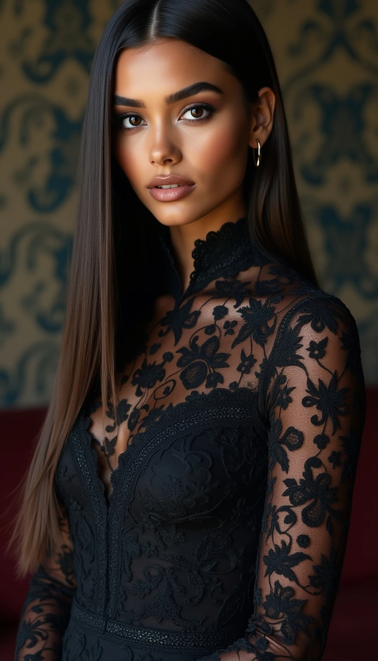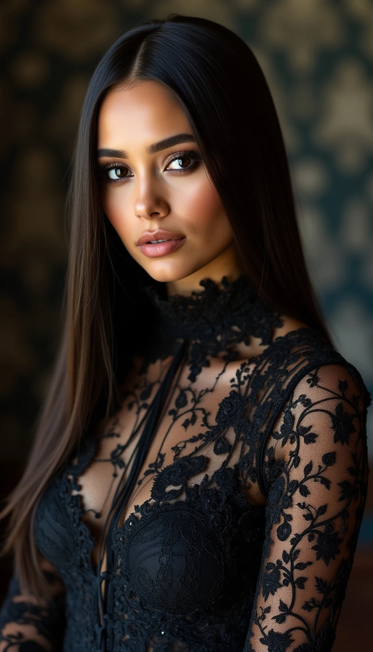 she is of northern African and western European descent, her skin tone is heavily tanned, her dark brown hair is very straight, her straight hair is sleek, parted in the middle, her eyes are dark brown, she has smoky eyeshadow, she has neutral lipgloss, she wears a detailed black dress made of lace with a high neck and long sleeves, the lace fully covers her upper body, the background is a dark room with a patterned wallpaper,