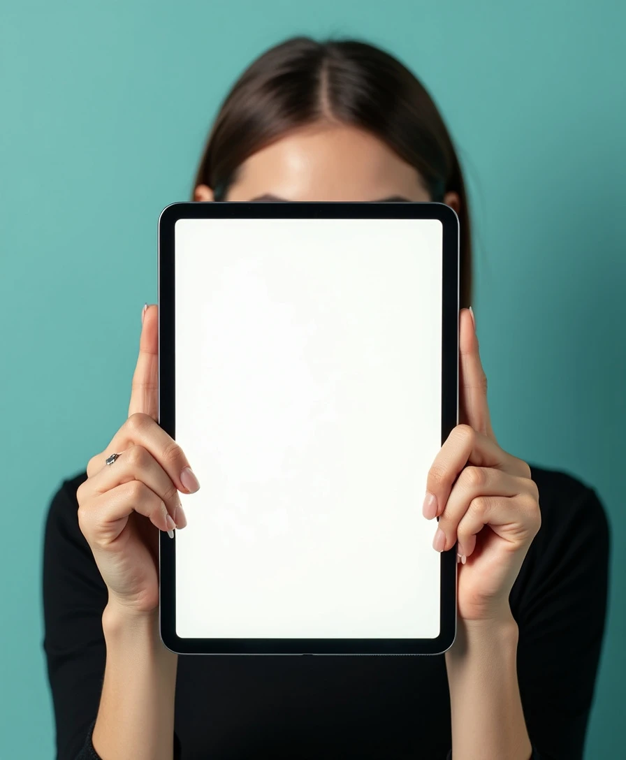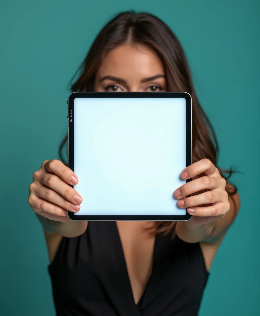 a sophisticated modern woman holding an close-up black iPad Pro screens display white screen facing camera placed detailed natural hands , the image is for her body, a faceless photo. the ipad pro is in the center of the image. the ipad displays the screen in the website design, the background is color aqua teal shade, Apple Macintosh advertising style