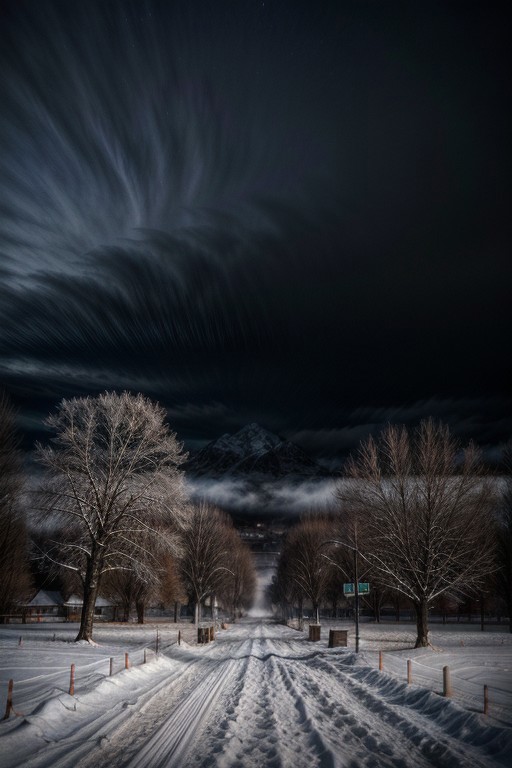 (masterpiece, best quality, highres:1.2), otherwordly snowy landscape, eerie atmosphere, night sky, foggy, harsh weather, snowstorm, blizzard,