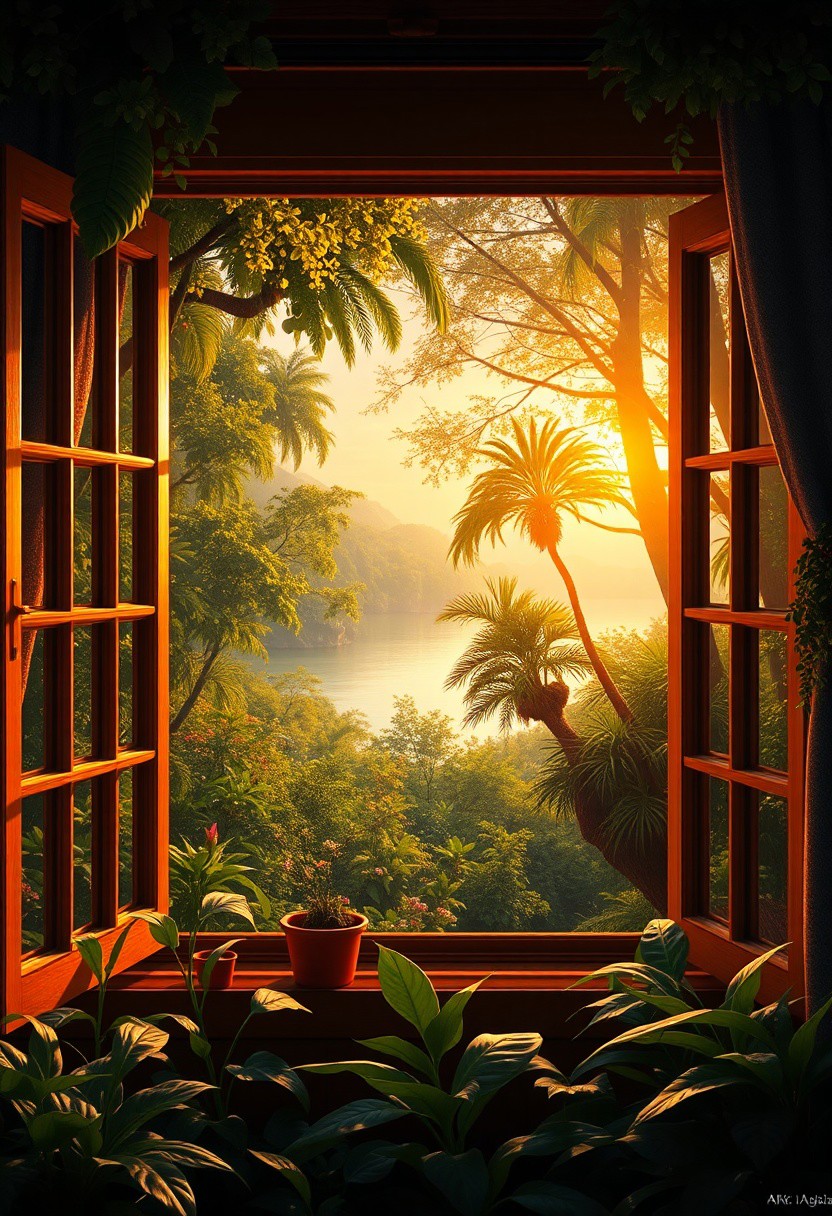 Cozy home window scene overlooking a vibrant jungle with a serene lake, warm natural lighting, highly detailed, photorealistic, digital painting, lush greenery, tranquil atmosphere, by Thomas Kinkade and Eyvind Earle, 4k resolution, masterpiece