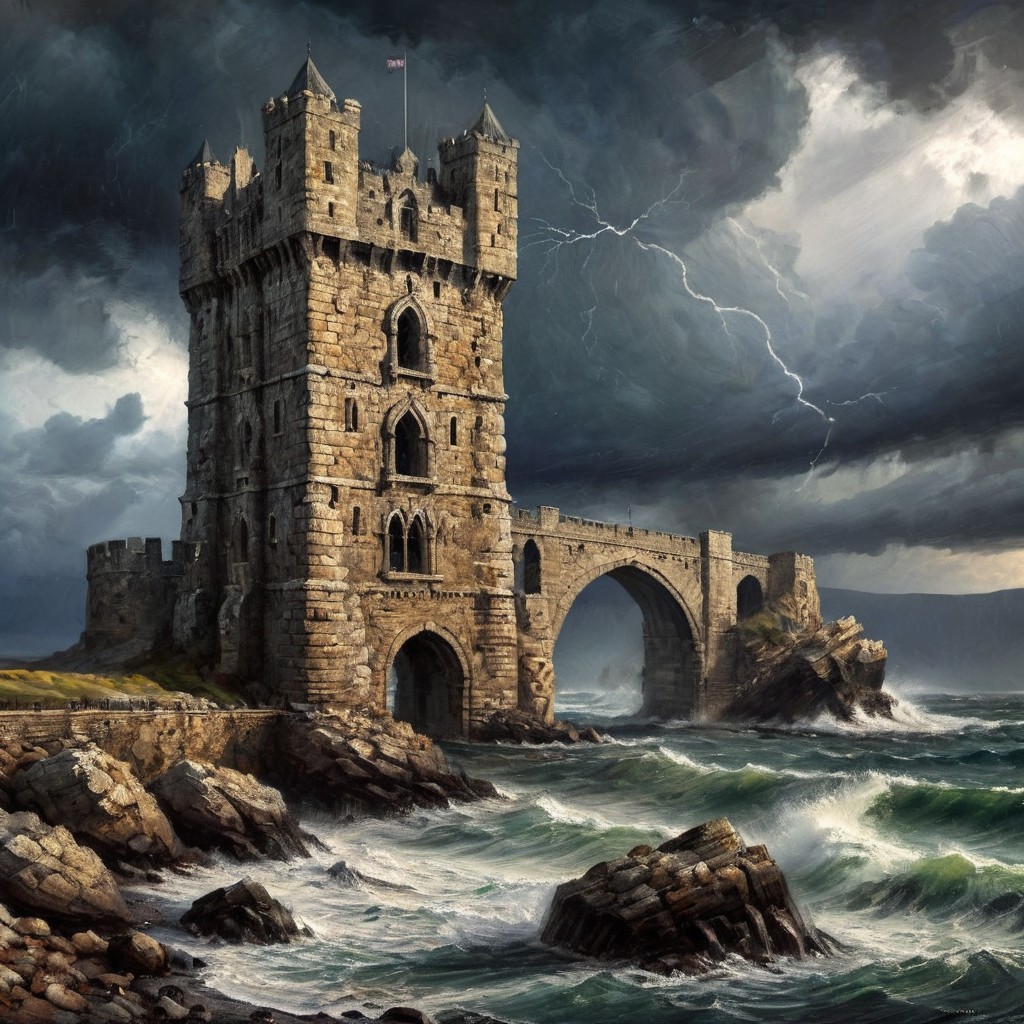 A dramatic image depicts an ancient gothic stone watch tower and bridge structure situated on a rocky coastline as a storm rages. The tower is cylindrical. The stonework is weathered and broken. The bridge, attached to the tower, has a single arch and is constructed from similar stone material. Tall rugged cliffs stretch away to one side as waves break against the partially submerged base of the tower and bridge, sending spray high into the air. Storm tossed clouds give a dramatic atmosphere to the scene.