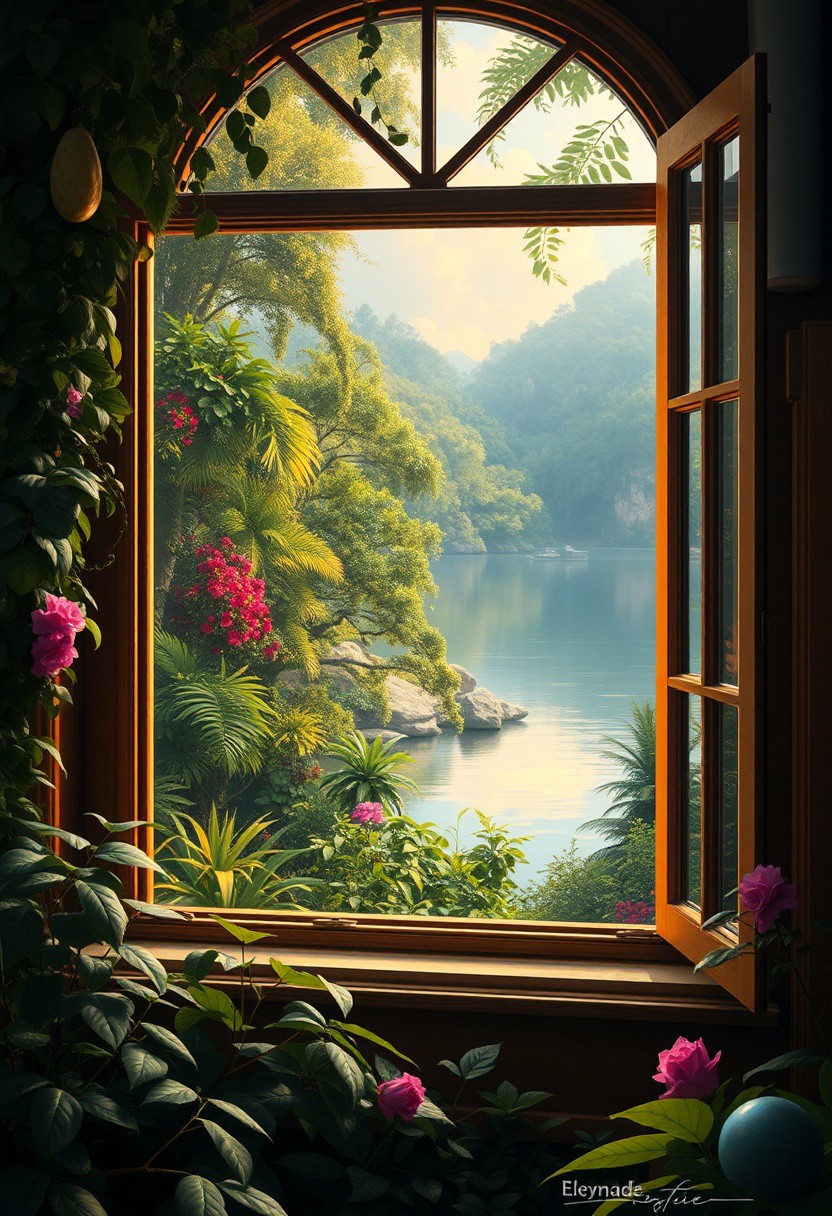 Cozy home window scene overlooking a vibrant jungle with a serene lake, warm natural lighting, highly detailed, photorealistic, digital painting, lush greenery, tranquil atmosphere, by Thomas Kinkade and Eyvind Earle, 4k resolution, masterpiece