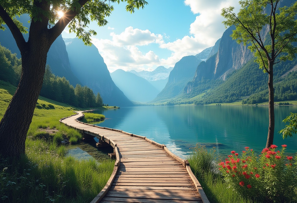 wooden planks make up a walkway leading to a beautiful lake along side stunning fauna and flora, , landscape photography, vast vistas, natural beauty, dynamic compositions, captivating scenery, immersive, serene