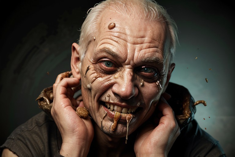 the smiling old man peeling off his rotting face infested with maggots, "unsettling scary and horrifying high resolution quality pixelart game style".