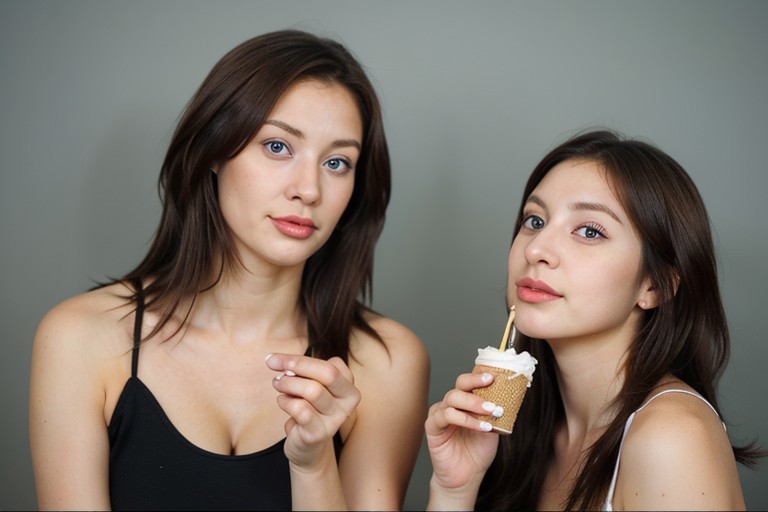 Woman 1 has the following characteristics: 173 cm tall, her weight is 52 kg, bust 86 cm, waist 86 cm, hips 86 cm, hair color: brown, eye color: blue, Caucasian, 23 year old. Woman 2 has the following characteristics: 168 cm tall, 55 kg, bust 86 cm, waist 63 cm, hips 89 cm, hair color: Light brown, eye color: green, Latina, 21 year old. two beautiful women eating ice cream.