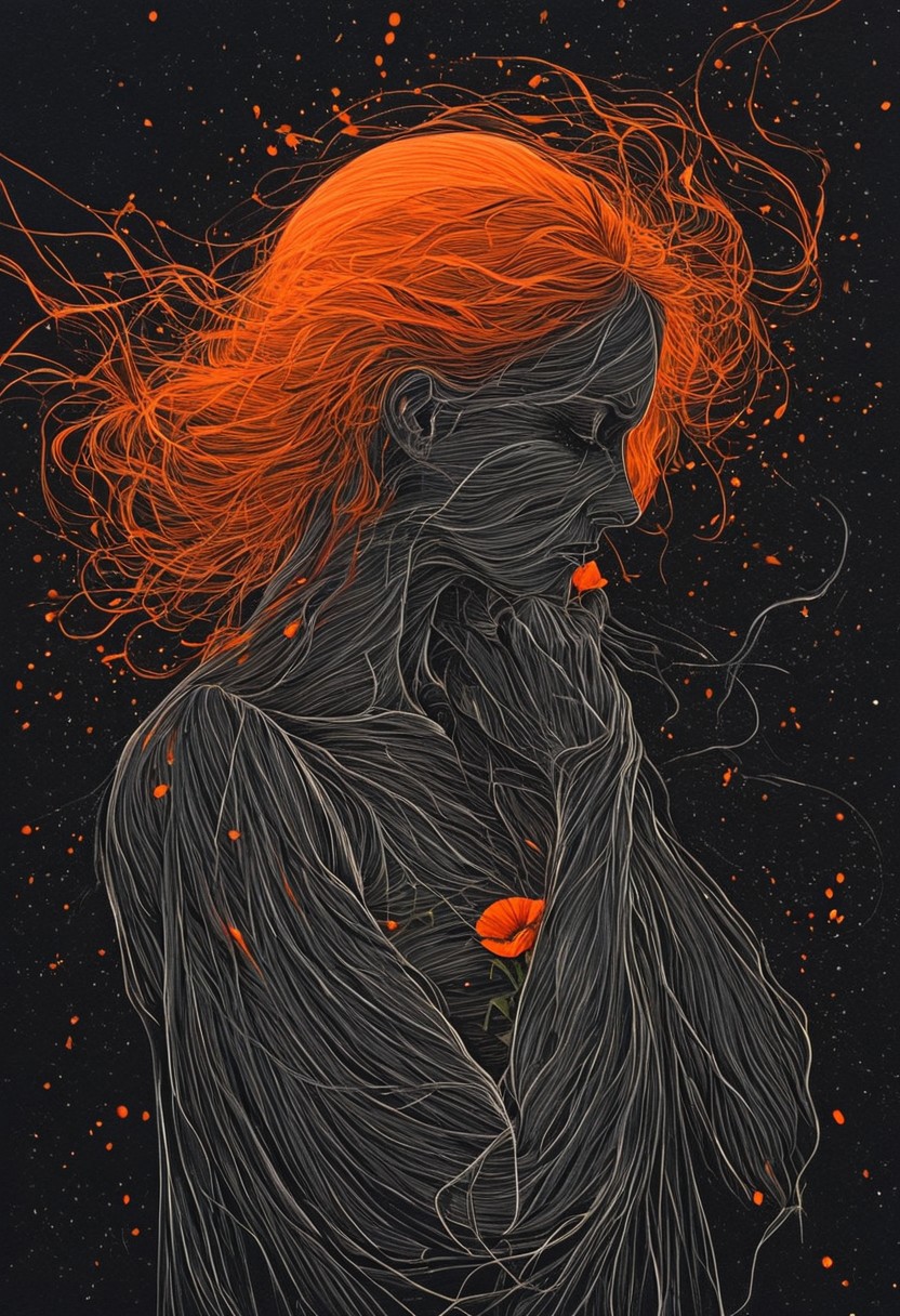 linquivera,coquelicot, beautiful woman, sorrowful expression, faded elegance, poignant atmosphere, lost beauty, melancholic aura, hauntingly captivating, timeless grief, stark contrast, delicate decay,line art,backlighting,wind,backlighting,stardust,(wind:1.2),knight,orange blood