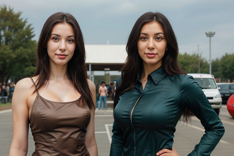 Woman 1 has the following characteristics: 173 cm tall, her weight is 52 kg, bust 86 cm, waist 86 cm, hips 86 cm, hair color: brown, eye color: blue, Caucasian, 23 year old. Woman 2 has the following characteristics: 168 cm tall, 55 kg, bust 86 cm, waist 63 cm, hips 89 cm, hair color: Light brown, eye color: green, Latina, 21 year old. two beautiful women pose for a photo at a moto exhibition There are several cars parked nearby.