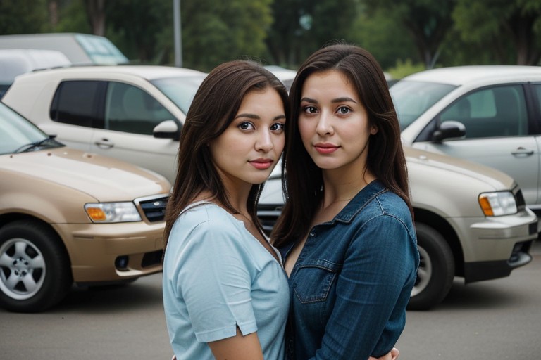 Woman 1 has the following characteristics: 173 cm tall, her weight is 52 kg, bust 86 cm, waist 86 cm, hips 86 cm, hair color: brown, eye color: blue, Caucasian, 23 year old. Woman 2 has the following characteristics: 168 cm tall, 55 kg, bust 86 cm, waist 63 cm, hips 89 cm, hair color: Light brown, eye color: green, Latina, 21 year old. two beautiful women pose for a photo at a fly exhibition There are several cars parked nearby.