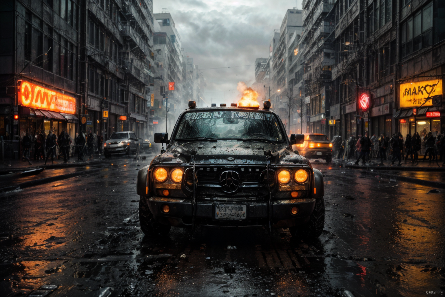 (RAW photo, 8k uhd, Analog style, Masterpiece, Best Quality, Highres:1.3), (dramatic, cinematic:1.2), BREAK, movie shot of (ultra-detailed:1.1), (striped:1.3) (military:1.4) (cyberpunk:1.3) (battlecar:1.35) (armed with turret machine gun and grenade launchers:1.33) (rushing:1.3) through (cyberpunk city street:1.35), ((glossy:1.1) technological futuristic design:1.2), (drifting:1.3), (neon lights:1.1), (wet asphalt, reflections:1.2), (firing tires:1.35), (water splash, puddles:1.32), (debris:1.32), (steam:1.3), (frightened:1.1) (pedestrians:1.4), (bright day:1.15), (daytime:1.15) (cloudy sky, (rain:1.1):1.2), (skyscrapers:1.15), BREAK, (photorealistic:1.2), (dutch angle:1.4), (light particles, colorful:1.2), (action movie scene, dynamic composition, fast, chasing:1.3), (motion blur, motion lines:1.3), (cyberpunk, science fiction, blockbuster, military vehicle, volumetric light:1.3), (daylight:1.2) (noir:0.5) (urban atmosphere, vehicle focus, cinematic tone, toxic, glowing, intricate, electricity, purple orange green color scheme, graffiti, (dust:1.1), no humans:1.2), BREAK, <lora:more_details:1.0>, <lora:zoom_slider_v1:2.0>