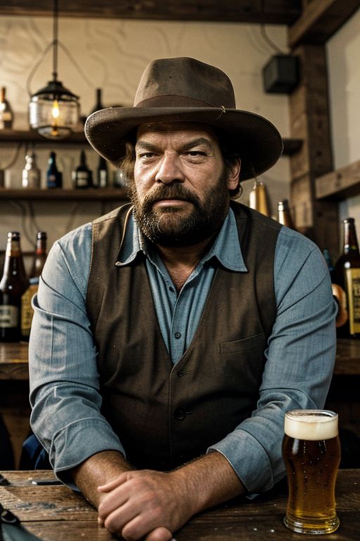 A robust man, Bud Spencer, Western scene, sitting at a rough-hewn wooden table in a bustling saloon, seemingly lost in thought. He has a full, unshaven beard and an old hat. A (big beer mug) in front of him. In the background, a vibrant scene unfolds: patrons crowd the bar, fighting and shouting. Despite the commotion, the man remains unbothered, his expression one of contentment and relaxation. The saloon is dimly lit by hanging lanterns and a few flickering candelabras, casting warm, golden light across the room and emphasizing the man's rugged features, wide angle, cinematic, old film, photography, masterpiece, best quality, high quality, highres, detailed, extremely detailed, ambient soft lighting, 4k,