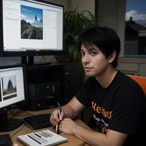 1boy, black hair, computer, dark, english text, indoors, male focus, monitor, shirt, t-shirt black hair, cloud, head chrome Steen scarf, mountain, orange shirt, outdoors, shirt, skirt, sky, solo, standing Distorted manga downward spirals (dark toned)
