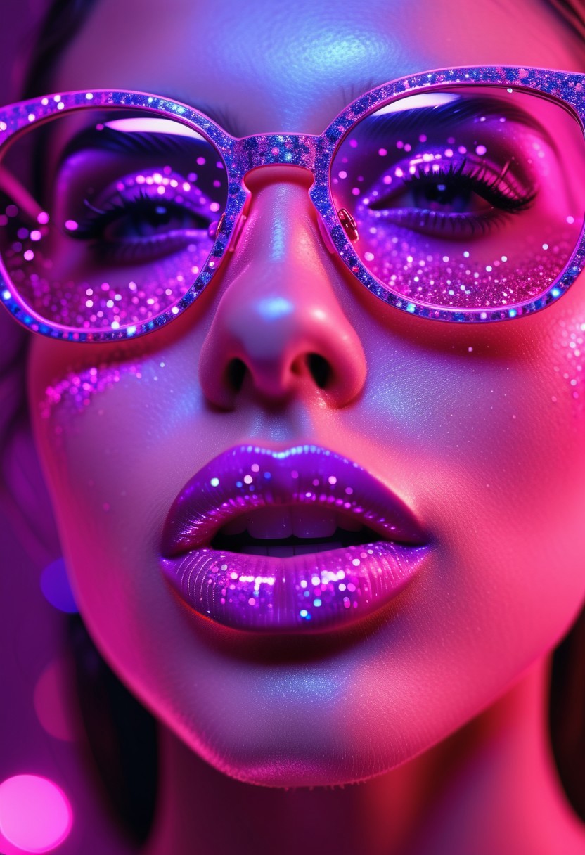 Neon-lit close-up, A hyper-realistic close-up of a beauty supermodel sexy girl face, big lips, bathed in neon pink and purple light with glittering particles on her skin, neon sunglasses with glitter textures patterns, fashion magazine style, beautiful background, Use soft colors and a shallow depth of field