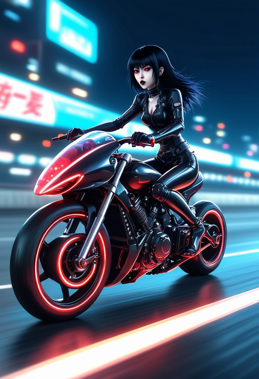 Stunning anime, illustration of Japanese goth woman, riding Akira-style futuristic superbike, long dragster-style bred bike with fairing, racing at speed on cypberpunk superhighway, travelling very fast, neon lights, bokeh, extreme motion blur of the background, night
