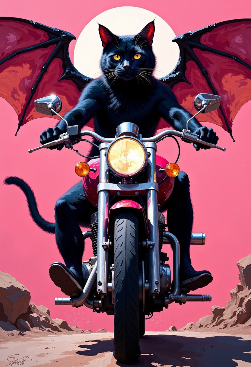 DB4RZ style painting The black cat devil riding a motorcycle symmetry and balance, pioneering unparalleled masterwork with superior details, ,(skin texture),masterpiece, top quality, best quality, official art,highest detailed,,atmospheric lighting, cinematic composition,complex multiple subjects, 4k HDRvaporwave style , , cyberpunk, vibrant, neon colors, ,
