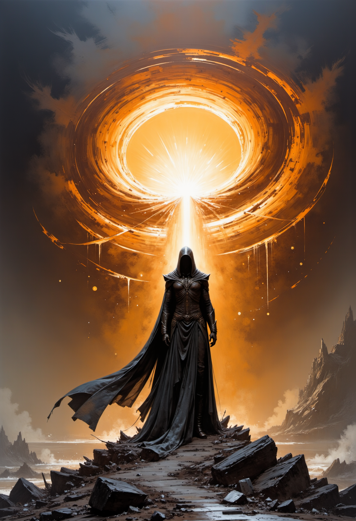 Hyper detailed traditional oil painting of a dark sorcerer standing before a massive vortex of swirling energy. His flowing robes are caught in the violent winds as he chants a forbidden incantation, summoning eldritch horrors from another realm. <lora:artisketchyfs-v02:1>
