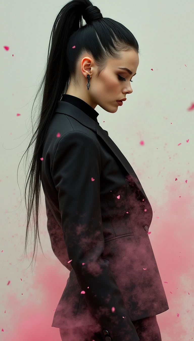 Style of Nobuyoshi Araki, Style of Mark Arian, Style of Rolf Armstrong, Style of Artgerm, Style of Anne Bachelier, Style of Tom Bagshaw, black high ponytail, she's wearing a black suite, no makeup, pink dust on her suit