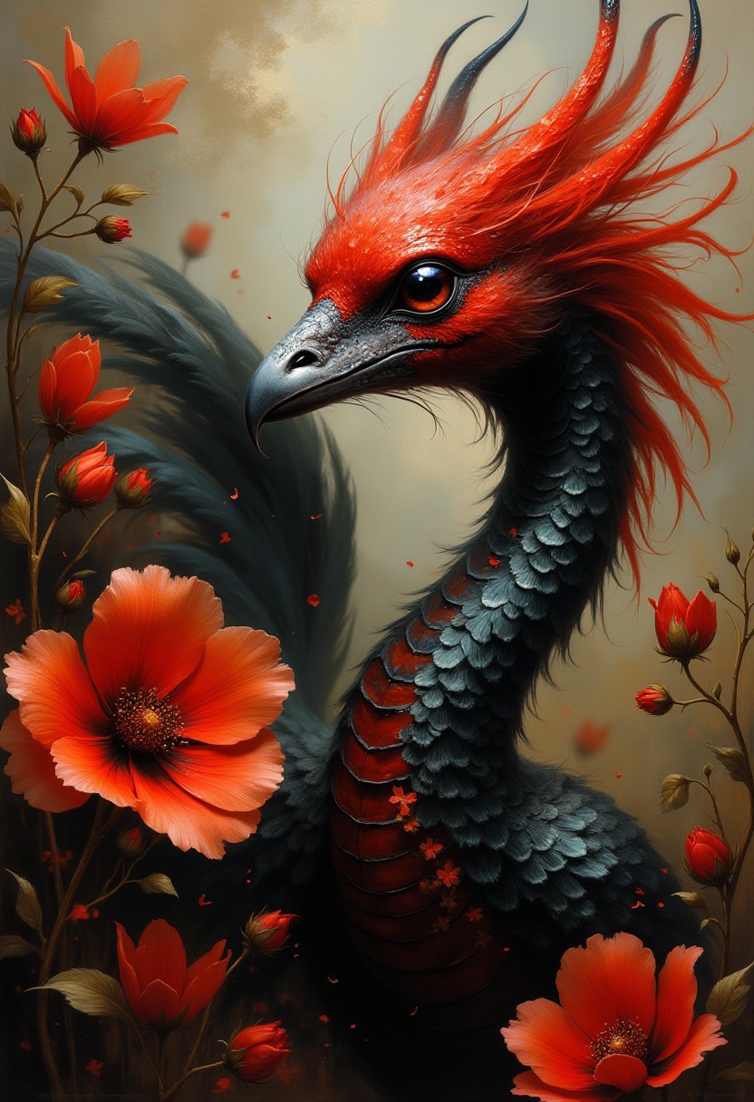 3th33r34l a closeup painting of a beautiful red and black creature that is a combination of a heron and a snake, it has both glittering scales and distinct feathers, and appears slender and magical, while it peers out from amongst red flowers. The atmosphere is dreamy, faded, and delicate.
