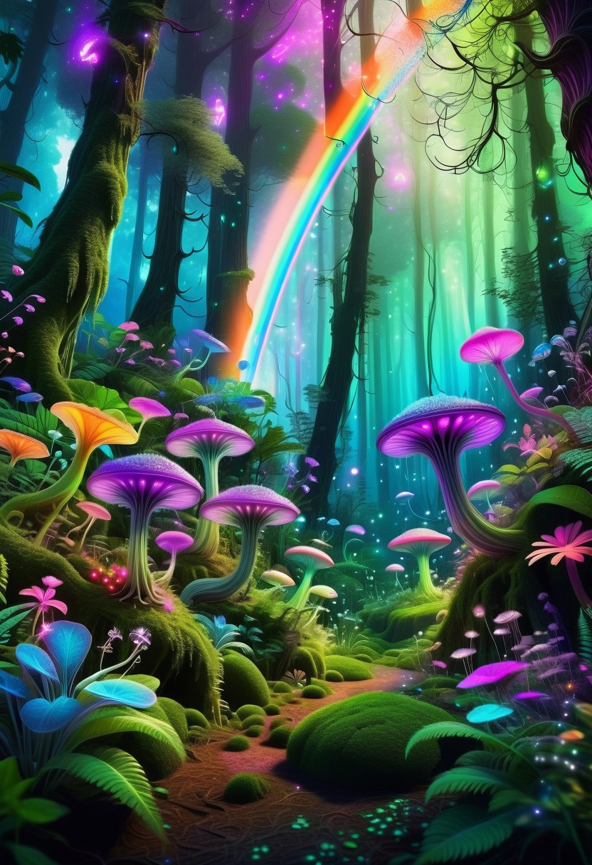 lush forest with alienplants with blooms and rainbow colored glowing sparkles