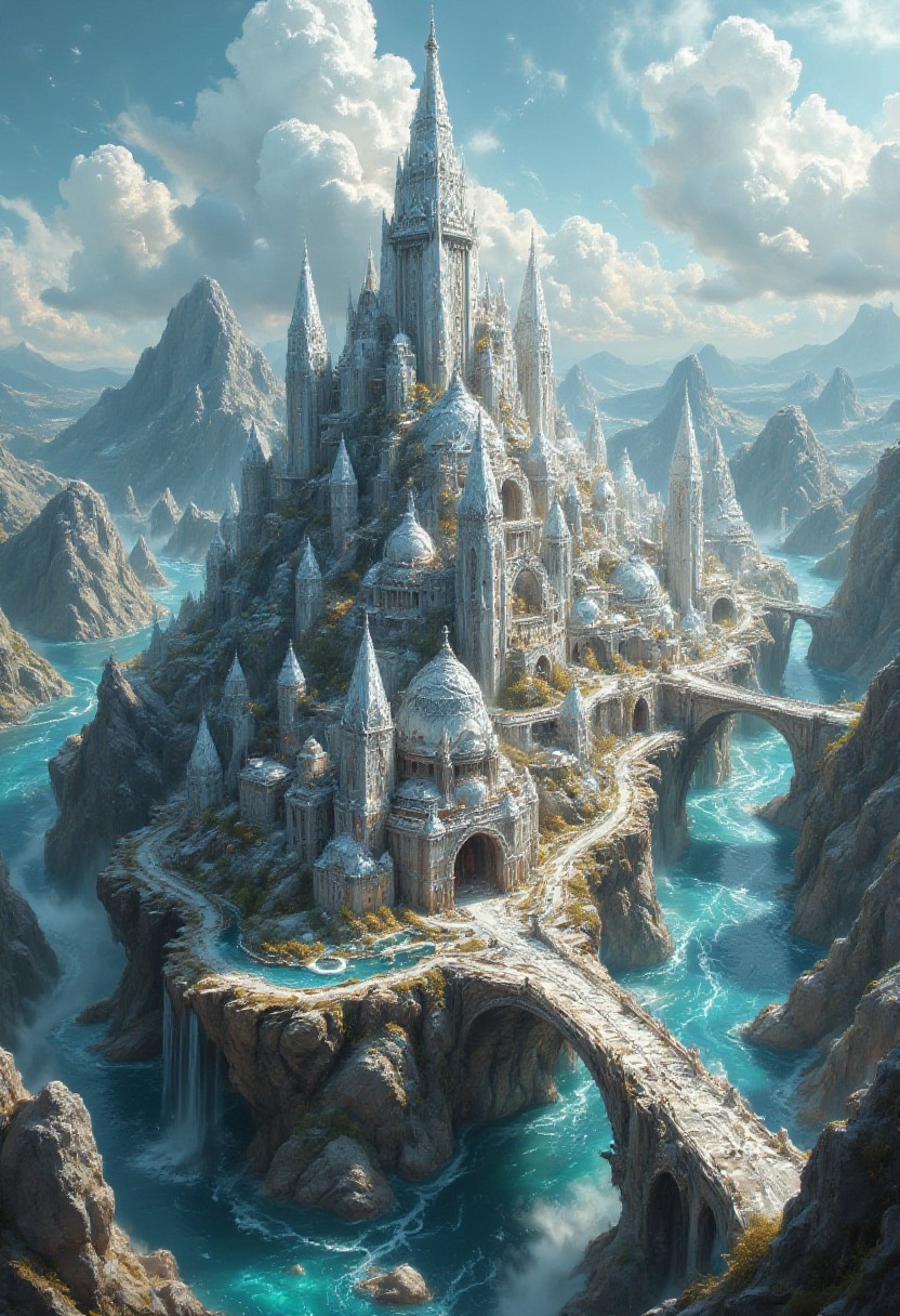 fantastical and realistic image, a detailed fantasy white city that stands on a drop-shaped island in the middle of a wide river. White bridges connect the city to the mainland. In the upper part of the city, a very tall decagonal white tower towering over the rest of the city. the tower is surrounded by other few of smaller towers. mystical touch, dreamlike and otherworldly atmosphere, sense of adventure and wonder, view from above, (score_9, score_8_up:1.1), score_7_up, a fine color ink lineart sketch, (reflective volumetric), raytracing, absurdres, dark, low-key