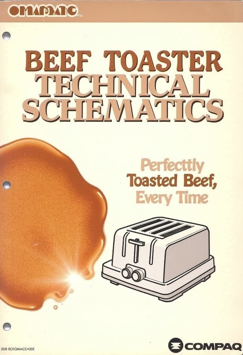 "COMPAQ BEEF TOASTER TECHNICAL SCHEMATICS": A bizarre, yet humorous manual for a fictional "Beef Toaster" by Compaq. The cover features blocky beige and brown fonts, with a diagram of the strange toaster. A large coffee stain dominates the left side, and the subtitle humorously reads, "Perfectly Toasted Beef, Every Time."