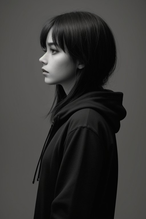score_9, score_8_up, score_7_up, score_6_up, photo bokeh 1girl, solo, breasts, upper_body, monochrome, greyscale, hood, from_side, profile, black_background, hood_up