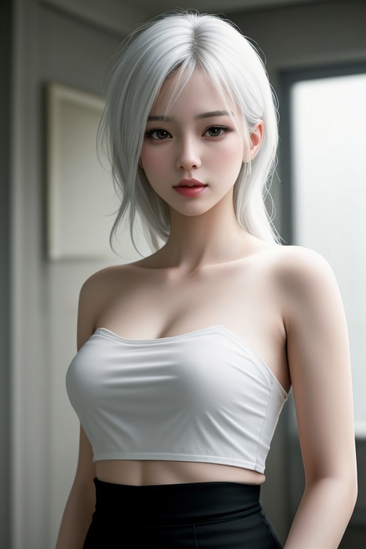 ((best quality, high_resolution, distinct_image)), sweet beautiful girll,white hair, oversized fully transparent top subsides, very deep neckline, very short top, K-pop singer appearance, medium breasts, bright mood