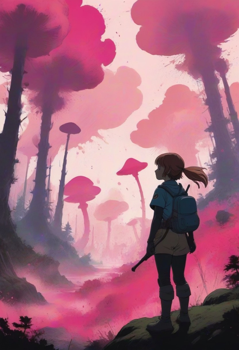 Studio Ghibli style, Nausicaa silhouette, backdrop of spore forest, eruptions of chromatic ink, fuchsia splashes, muted shades disrupted by vibrant saturation, [betterandrich::0.0],