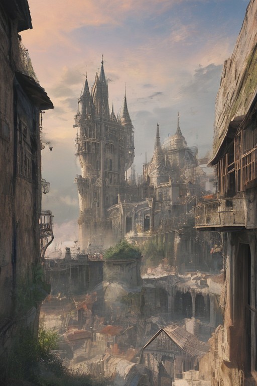 medieval fantasy tower spiraling towards the sky, daylight sun touches the landscape, colorful sky