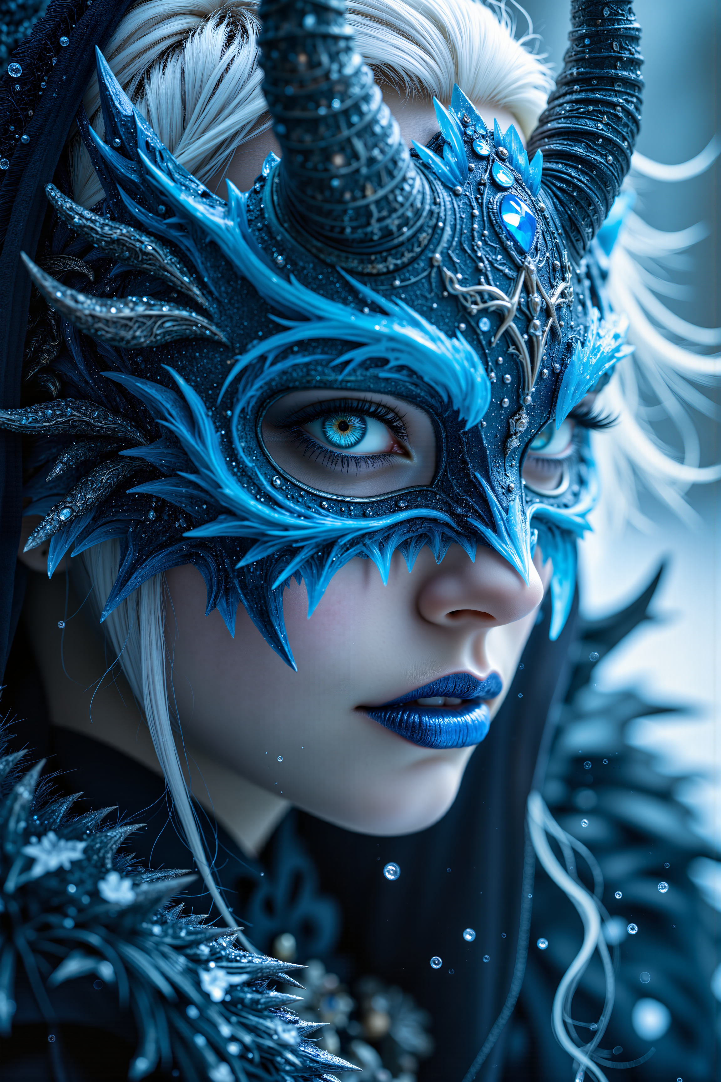 A hyper-realistic portrait, photorealistic photo close-up image of A close-up portrait of a female, with short, spiked white hair and pale, almost translucent skin, belonging to a mysterious race of ice witches. She appears to be in her early 30s, her gaze cold and calculating beneath a sinister, horned mask. The mask is carved from ancient, enchanted ice, with jagged, crystalline horns that protrude from either side, each one glistening with frozen shards. The surface of the mask is smooth, but faint blue runes pulse with a chilling light, spreading an aura of cold that seems to seep from the mask itself. Her lips are blue and slightly parted, revealing sharp, icicle-like teeth, and her icy blue eyes glow with a dangerous, arcane power. The background is a swirling mist of frosty whites and cool blues, with hints of silver that shimmer like the Northern Lights, creating a scene that is both beautiful and terrifying. The combination of the horned mask and the icy backdrop gives her the appearance of an ancient, powerful witch, commanding the frozen forces of her homeland. (photography, high-resolution, dynamic, energetic,hyper-realistic, dramatic lighting, shallow depth of field.), detailmaximizer, MythP0rt<lora:midjourney_whisper_flux_lora_v01:0.55><lora:aidmaMJ6.1-FLUX-V0.1:0.4><lora:FluxMythP0rtr4itStyle:0.4><lora:detailed_flux_ntc:2.2><lora:aidmaImageUpgrader-FLUX-V0.1:0.65>