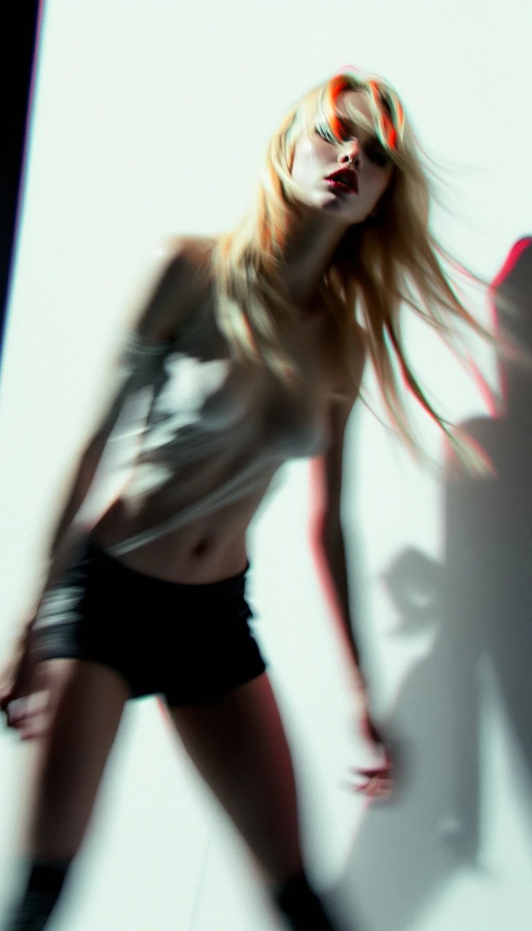 IMG_1111.CR2 outlandish fashion editorial, style of ROBIN THICKE BLURRED LINES music video for NUMERO magazine, tall blonde supermodel expressive mid-movement pose, plain white background, single front flash, low-angle shot, bright specular highlights, sharp defined dark shadow on background, motion blur, anaglyph effect with film grain