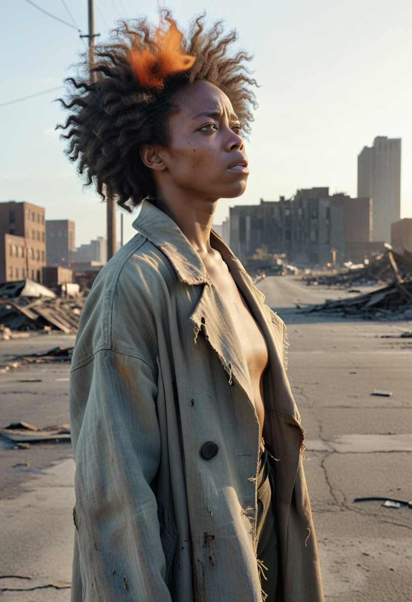 Amidst a desolate, post-apocalyptic cityscape, an African-American woman with deep, rich skin and cropped afro-textured hair stands in the foreground, her anguished expression illuminated by a single soft sidelight. She wears a long, tattered coat, its frayed edges blowing in the wind, and gazes forward with a hand on her head and a slightly tilted head. A faint film grain and subtle color grading create a sense of desolation, with a muted palette of grays, browns, and tans, punctuated by vibrant orange flames in the distance.