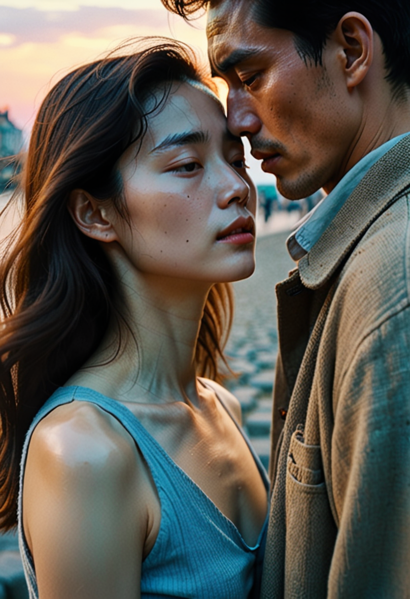 A stunning, golden-hour cinematic scene in the style of Wong Kar-wai, with fine film grain and warm, nostalgic color grading, evoking a sense of timelessness. A delicate Eurasian woman with porcelain skin, dark hair, and expressive brown eyes, stands embracing a rugged, sun-kissed Italian man with chiseled features and deep-set blue eyes, their bodies swaying gently in the soft breeze on a weathered, cobblestone seaside promenade at dusk. Soft, diffused natural light wraps around them, with the warm glow of string lights in the background, creating a romantic ambiance. The woman's eyes are closed, her face tilted upwards, as the man's lips brush against her forehead in a tender moment, their bodies bathed in the soft, orange hues of the fading sun.