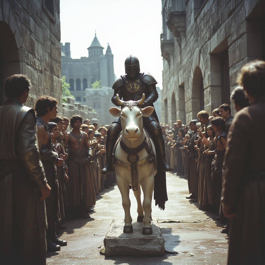ArsMovieStill, 80s Fantasy Movie Still, a silly knight riding on a sculpture of a cow. The scene is a grimy street in a medieval fantasy city, a dirty road going through an alleyway surrounded by medieval stone structures. People wearing peasant clothes look up at the strange knight riding a cow sculpture with confused expressions