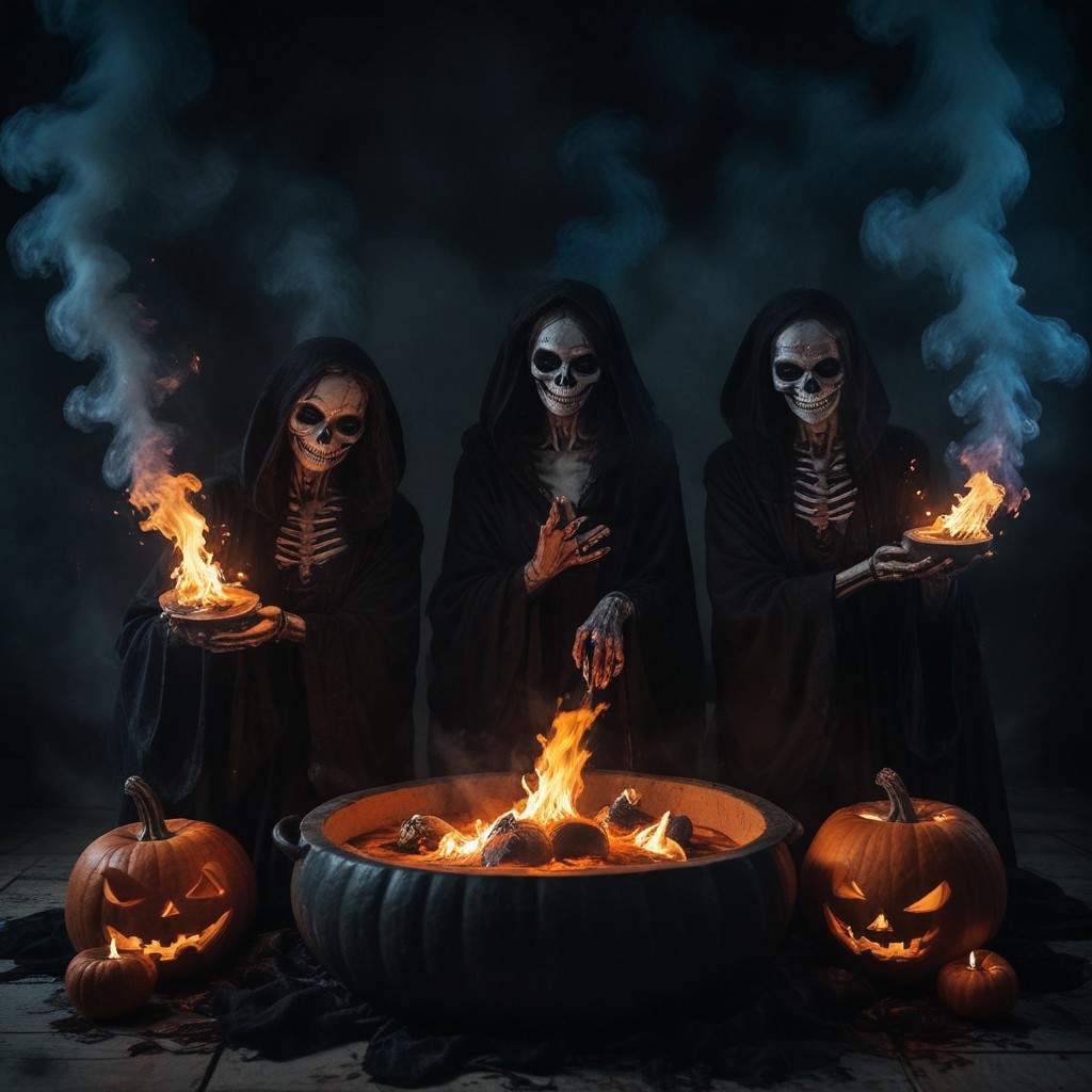 candles burning inside pumpkins, a bloody bed, two skeleton women dressed in black robes down to their knees, with a scary grin on their faces, and a boiling cauldron right next to them with blue smoke coming out of it. dark atmospheric, dynamic pose, dark background hell, volumetric lighting